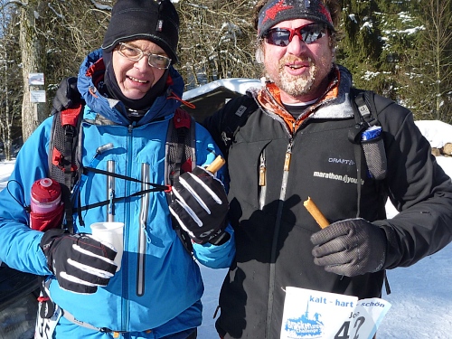 Startnummernausgabe. Auf der Nummer steht: „ Hart - Kalt - Schön“ darunter mein Name. Die kennen mich. Aber es ist eine Erfindung von Günter Kromer und mehr als passend für den BC und deswegen der Leitspruch dieses Extremlaufes.