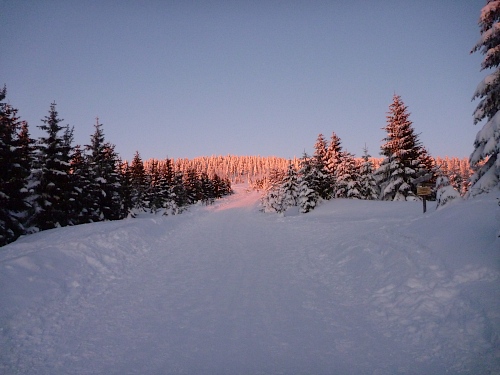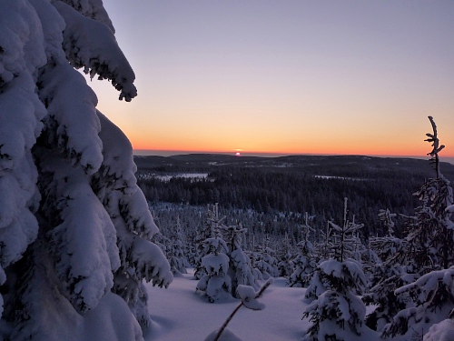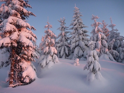 Und dann stehe ich da, der kältetrockene Mund steht mir offen und die aufgeplatzen Lippen zittern. Ich sehe den Brocken. Durch die eiskalte Sonne in ein flammendes Rosa getaucht steht das gewaltige Massiv vor mir. Wie in einem Weihnachtstraum glitzern die vollbepackten Tannen wie Rosenquarz.