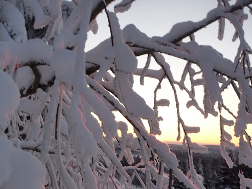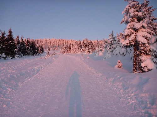 Vier eisige Kilometer habe ich noch vor mir, versuche mich oberhalb der rosa Lichtgrenze zu halten, die Sonne versinkt langsam und grausam hinter dem Horizont, hinterlässt alle Menschen in ihrer klirrenden Einsamkeit. Doch ich bin überwältigt. Kann sein, dass ich Tränen vergisse, die mir im Abendlicht rosarot auf den Wangen gefrieren. Aber ich würde es nie schreiben.
