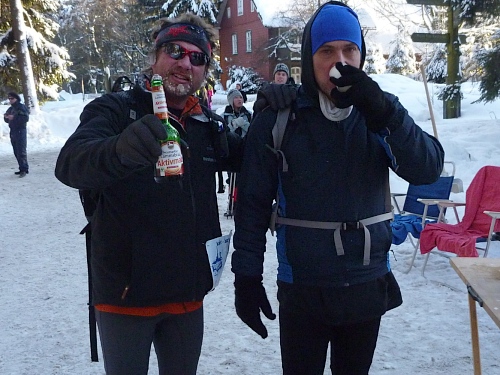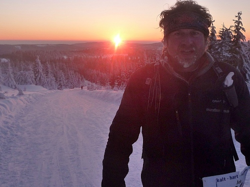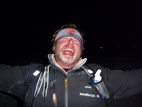 Dann sehe ich die Türme über den frostig erleuchtet Himmel, bleibe wieder stehen. Kein Endspurt. Diesen Augenblick will ich genießen. Oben gröhlen und rufen einige im Zielbereich, ich solle doch weiterlaufen. Doch ich bleibe stur stehen, will ein bißchen Ruhe und tief durchatmen, diesen erhabenen Augenblick mit diesen extremen Lichtverhältnissen geniessen. Gefrierpunkt: 11:59 Stunden. Geil. Punkt aus. Fertig. Ich bin zurück aus der Eiseskälte, habe den härtesten Winterextremlauf Deutschlands überlebt.