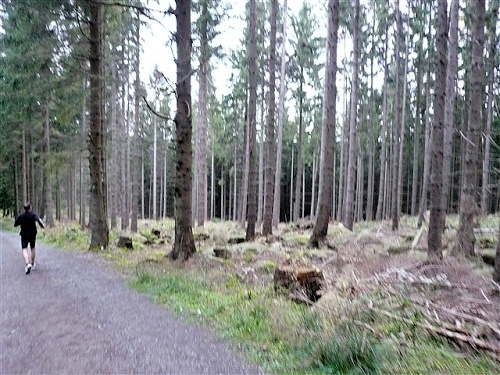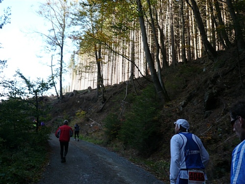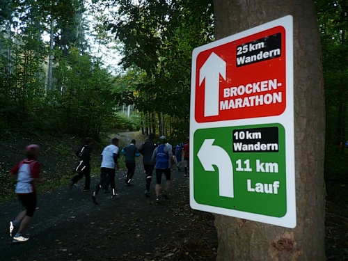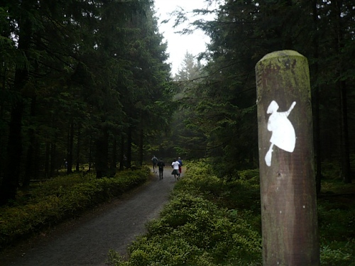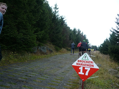 Mancher der berühmten Marathons hat seine legendären Punkte, von denen man schon oft gelesen und gehört hat, so auch der Brocken-Marathon: Der nämlich hat den Plattenweg. In dunklen NVA-Tagen als Kontrollweg entlang des damaligen „antifaschistischen Schutzwalls“ angelegt, erschwert er uns heute das Vorwärtskommen. Eigentlich sollte man meinen, daß er es unterstützt, aber man tritt immer wieder leicht in die im Beton ausgesparten Löcher und bleibt mit den Schuhspitzen darin hängen. Ich laufe jetzt konsequent auf den schmalen, durchgehenden Betonstreifen, das paßt. Aaah, das ist sie wieder, meine kleine Hexe! Wo ist denn Dein Besen? Und Deine Nase? Schwupp, hat sie sich die wieder aufgezogen und strahlt. Den Kleinen Brocken überquerend, müssen die km 17 und 18 wieder gegangen werden.