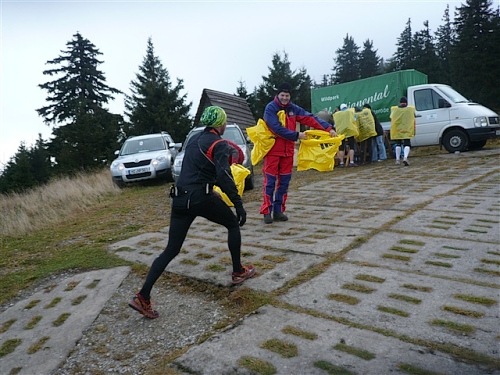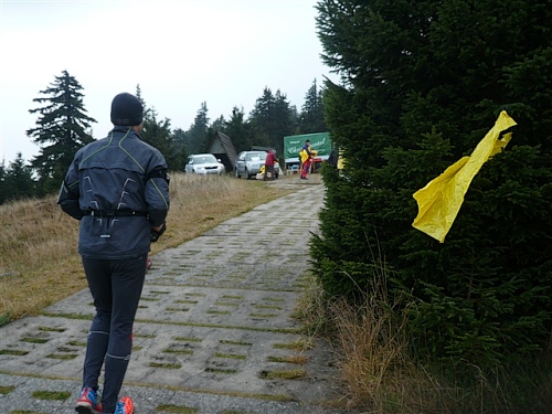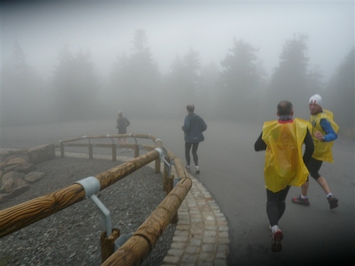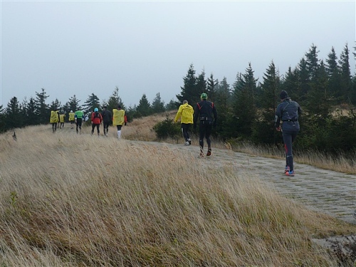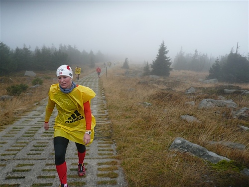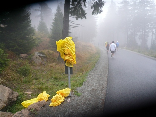 Jetzt zeigt sich, wie gut und ernst zu nehmen die Hinweise auf das launische Brockenwetter sind: Es hat sich in kurzer Zeit total zugezogen und der Wind frischt stark auf. Ich freue mich, daß die Chronistenpflicht auch viele Vorteile mit sich bringt. Denn so dreht man sich ab und an auch mal um und sieht so Dinge, die dem nur auf den Boden schauenden Läufer entgeht, so z.B. der phantastische Blick auf die Eckertalsperre, über deren Staumauer einst die innerdeutsche Grenze verlief. Aber dafür habt Ihr ja uns laufende Reporter. Ich entschließe mich, die Jacke anzuziehen, denn auf der freien Plaine zieht es mittlerweile erbärmlich, der Wind fährt in alle Glieder. Keine blöden Bemerkungen jetzt bitte. Kaum habe ich auch die Mütze zusätzlich zur Kappe aufgezogen, kommt der Ausgabepunkt für Ganzkörperkondome, in die freundliche Helfer hineinhelfen. Fortan strebt eine Heerschar gelber Männlein und Weiblein gen Brocken. Und ein oranges Männlein.