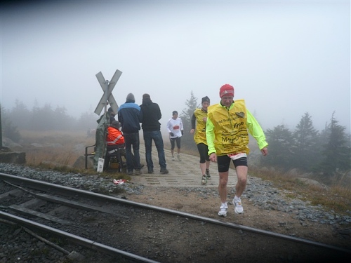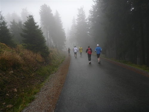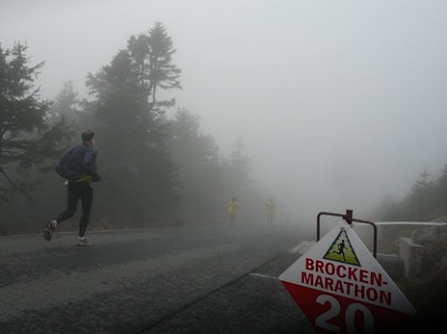 Heute mache ich einen auf Eberhard und habe erstmals bei einem Lauf überhaupt zusätzliche Klamotten dabei, eine Mütze, Handschuhe und eine leichte langärmelige Jacke stecken in meinem Laufgürtel. Ich meine, trotz „nur“ 900 m effektiver Höhendifferenz zwischen Start-/Zielort und Brockenspitze ist mit der Witterung hier nicht zu spaßen. Im letzten und diesen Sommer bei meinen alpinen Marathons (Jungfrau bzw. Zermatt) konnte ich mich auf jeweils über 2.000 m Höhe naß im Gras von der Sonne trocknen lassen, das ist heute deutlich anders, auch wenn es nicht im Ansatz so hoch hinaus geht. Bei dem angekündigten 1° und nicht auszuschließendem Niederschlag auf dem Gipfel muß man es nicht herausfordern und bis ganz nach oben in „kurz“ laufen. Angeblich hat es oben schon geschneit, hörte ich gestern, aber das werde ich ja bald persönlich in Augenschein nehmen können.