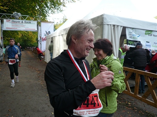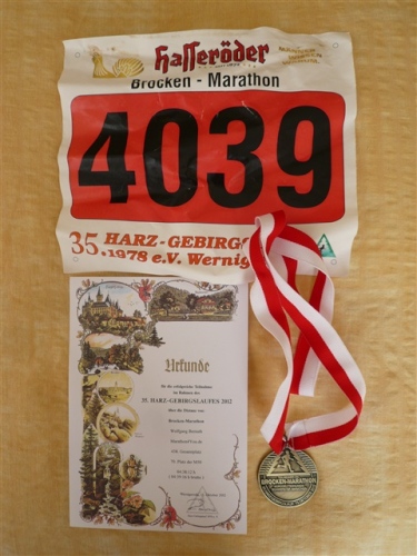 Ich freue mich über die schön Medaille, greife mir ein letztes Mal meine kleine Hexe, die deutlich vor mir angekommen ist und begebe mich, um die drohende Gefahr akuter Unterhopfung zu bannen, zum Hasseröder-Stand, jeder bekommt eines für seinen Gutschein. Gott sei’s geklagt, ER kann also im nächsten Jahr kommen. Eine sehr schöne Soforturkunde (DIN A 5) mit alten Postkartenmotiven nehmen wir direkt mit und bei einer Riesenportion leckerer Erbsensuppe lassen wir diesen tollen Tag, von der Sonne beschienen, im Kreis vieler Mitläufer ausklingen. Trotz harter Konkurrenz war das bisher der schönste meiner bisherigen deutschen Mittelgebirgsmarathons, ich habe nicht ein Fitzelchen zu meckern. Jajaja, der Kyffhäuser steht noch aus! 1 mit Sternchen also für den Brocken-Marathon, dringend zur Nachahmung empfohlen – besonders den Wessis, die hier in eklatanter Weise die Minderheit bilden!