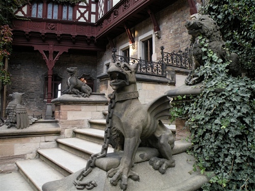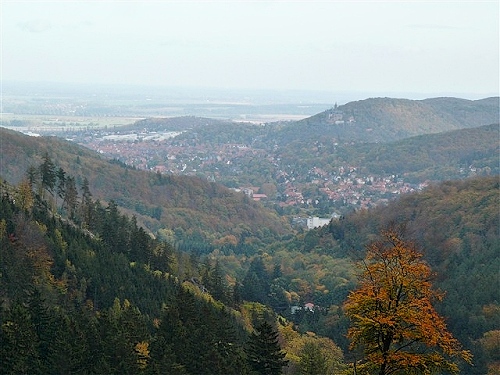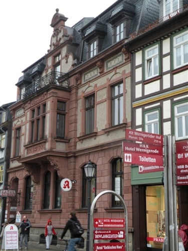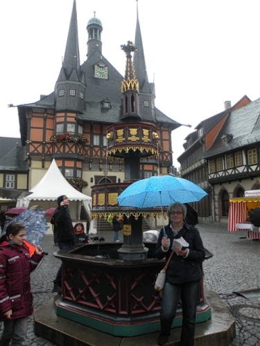 Vorerst aber befinden wir uns am Fuße des Brockens auf 250 m Höhe in Wernigerode. Das 34.000-Einwohner-Städtchen („Bunte Stadt am Harz“) besticht nicht nur durch das 100 m über ihr gelegene neugotische Schloß, sondern auch über einen im wesentlichen aus niedersächsischen Fachwerkhäusern bestehenden Stadtkern. Diesen können wir am Freitag ausgiebig bewundern, denn wir sind bereits am Vormittag angereist. Alleine das Rathaus von 1277 und dessen umgebende Gebäude sind die Reise wert, eine derartige Dichte an Fachwerkhäusern haben wir noch nicht gesehen. Dank unserer Unterkunft in einem schönen Jugendstilgebäude am Rande des historischen Stadtkerns können wir alles problemlos fußläufig erreichen. Das schlechte Wetter haben wir mitgebracht, aber besser es regnet sich heute aus als morgen.