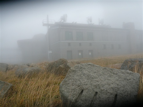 Km 19, gleich muß es doch soweit sein. Schnee liegt zwar keiner, aber Heinrich Heines Eintrag ins Gipfelbuch („Viele Steine – Müde Beine – Aussicht keine – Heinrich Heine“) kann ich bestens nachvollziehen. Dann zucke ich richtiggehend zusammen, als fast unmittelbar neben mir der (Sende?)Mast auftaucht, der nur ganz schemenhaft zu erkennen ist. Riesenhoch ist das Teil. Und dann erblicke ich endlich den berühmten Felsen. Noch von hinten, dann sehe ich bei der Umrundung auf der Vorderseite das genauso berühmte Schild mit der Höhenangabe 1.142 m. Zeit für Heldenfotos! Es ist so kalt, daß sich selbst der Schutz meiner Kameralinse nicht mehr richtig öffnet. Na ja, das gibt doch die richtige Würze.