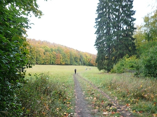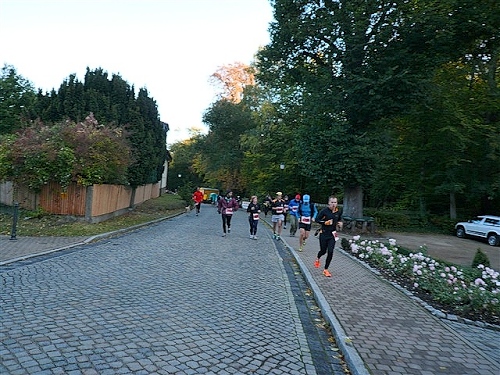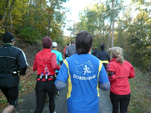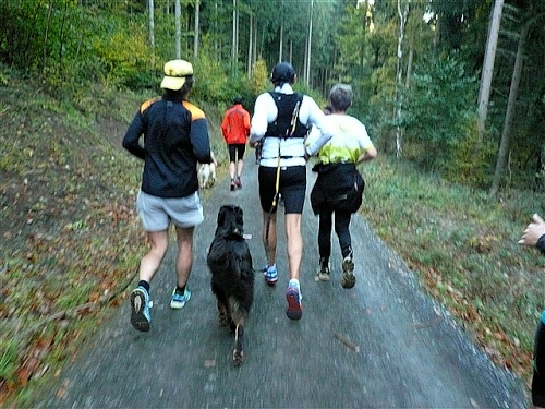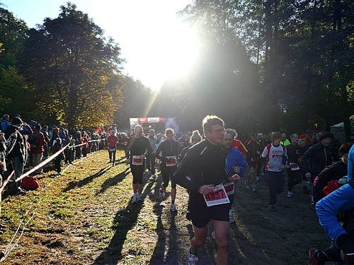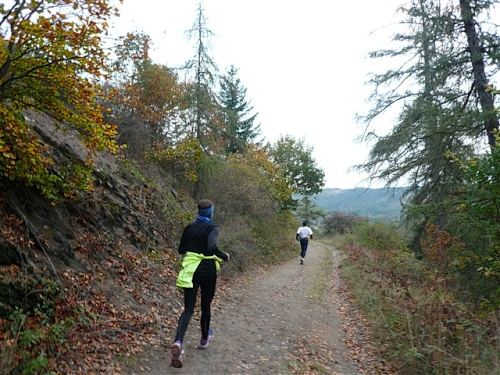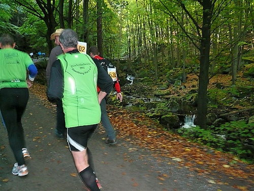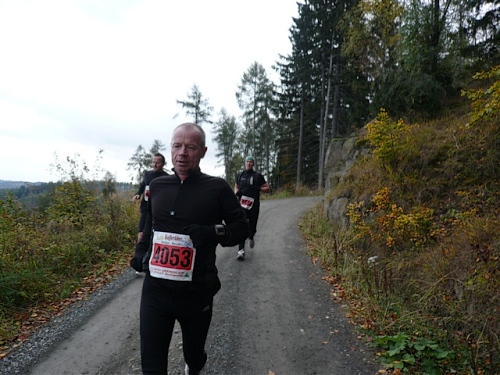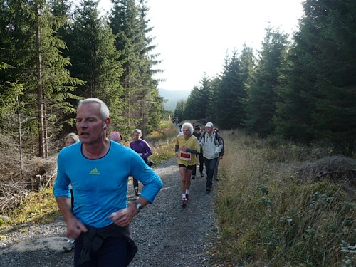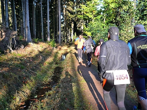 Die ersten km sind für mich sehr angenehm zu laufen, die leichte Profilierung gefällt mir, auch wenn ich auf dem vergleichsweise engen Weg ziemlich eingesperrt bin. Ich hatte einige Startfotos geschossen und mußte mich (Nettozeitmessung!) über die Zeitmeßmatte ins hintere Feld eingliedern. Aber was spielt das für eine Rolle, gesundes Ankommen ist angesagt. Bald überhole ich Sigrid, die mit ihrem Dauerbegleiter HaJo diese schwere Strecke auf sich nimmt. Beide sind mittlerweile deutlich in den Siebzigern, da bin ich doch mal gespannt, ob das in Anbetracht des Zeitlimits gut gehen wird.