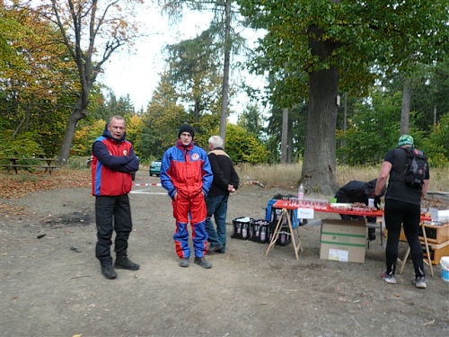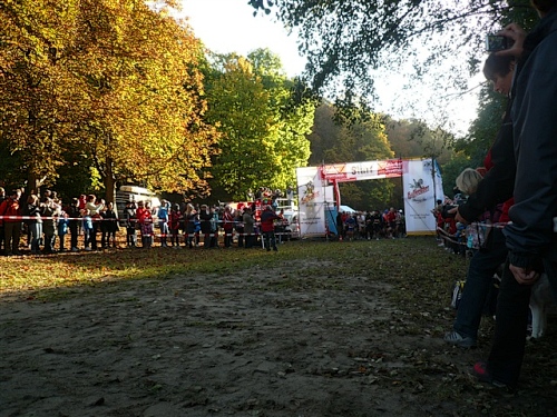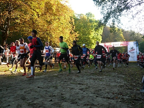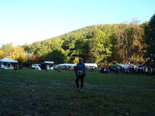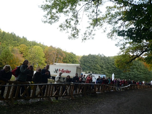 Nach durchregneter Nacht geht unser banger Blick beim Frühstück in Richtung erste Morgenröte und – Tschacka!- keine Wolke am Himmel. Trotzdem ist der Start-/Zielbereich im Stadtteil Hassorode gut gewässert und wir sind froh, uns für Trailschuhe entschieden zu haben, auch wenn wir damit ein paar Gramm mehr durch die Gegend schleppen müssen. Die sind jetzt in Anbetracht der Streckenbeschaffenheit kein unbedingtes Muß, schaden aber keinesfalls. Gelernt habe ich jetzt auch die Herkunft des bekannten Hasseröder Getränks und damit eine eigentlich unverzeihliche Bildungslücke geschlossen. An der sog. Himmelspforte geht es los, dort liegt quer über eine große Wiese auch das Ziel. Übrigens empfiehlt sich eine frühe Anfahrt, denn die Parkmöglichkeiten um den Ort des Geschehens sind überschaubar.