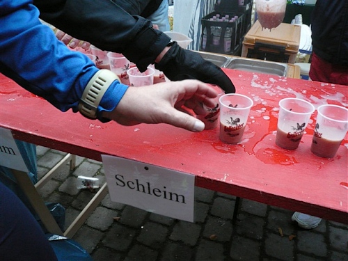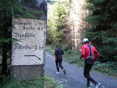 Nach reichlich 9 km erreichen wir das Städtchen Ilsenburg, das auf gleicher Höhe wie Wernigerode liegt. Jeden erarbeiteten Höhenmeter haben wir also wieder verloren. Gut, deren zehn sind übrig geblieben, wer es ganz genau wissen will. Hier gibt es das erste Mal Flüssignahrung und, ja, dann geschieht – endlich! - etwas von epochaler Tragweite: In meinem elften Marathonjahr koste ich ihn erstmals. Den Schleim. Das mußte jetzt sein, denn ihn nicht zu kennen, ist eine weitere unverzeihliche Bildungslücke. Zugegeben, optisch vielleicht nicht gerade erste Wahl, ist er sensorisch mehr als akzeptabel und hervorragend in der Wirkung. Für diejenigen, die damit nichts anfangen können: Das ist ein trinkfähiger, gesüßter Haferbrei. Wer braucht da noch Gels & Co.?
