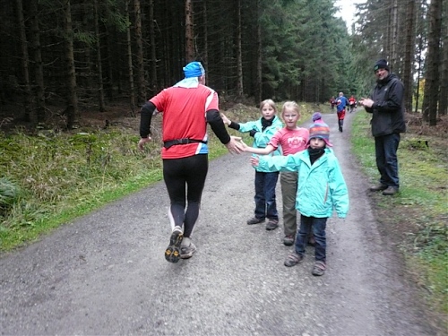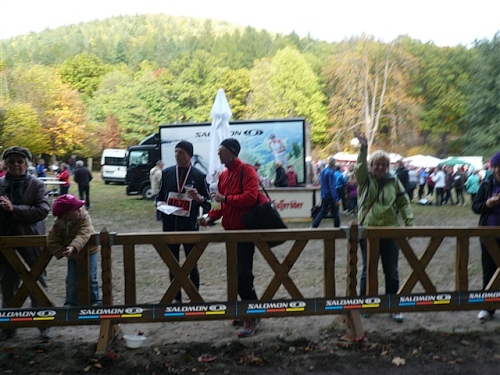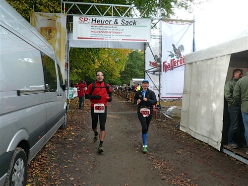 Bei km 34 gibt es nochmals Nachschub und die letzten fünf km werden rückwärts gezählt, mental ganz sicher förderlich. Klaus Egedesö, der nette Däne (viele Grüße an den Chef und Joe), mit dem ich schon bei der Startnummernausgabe gesprochen habe, spart sich ein paar Körner auf, denn er will morgen noch nach Bräunlingen zum Schwarzwald-Marathon. Man gönnt sich ja sonst nichts! Die letzte Verpflegungsstelle an einer alten Buche lasse ich aus und mache mich gleichermaßen auf die Socken und die letzten beiden km. Über eine große Wiese hinweg tauchen wir letztmals in den Wald ein, die Sprecherin ist schon zu hören und mein Weib freut sich, mich nach deutlicher Verspätung doch wieder vereinnahmen zu können. 4:38, au Backe. Macht aber nichts, in diesem Jahr stehen noch große Aufgaben an und daher ist es sinnvoll, mich nicht völlig verausgabt zu haben.