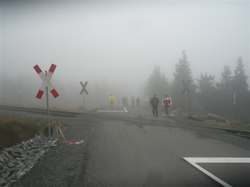 Fast wäre ich an der 1.000 m-Marke vorbeigedüst, ohne sie zu knipsen, denn mittlerweile bin ich wieder in den Laufschritt gefallen. Ich überquere das Gleis der Brockenbahn, das durch Streckenposten gesichert ist. Sollte die Bahn kommen, ist das Überqueren bei Strafe der Entmannung verboten. Die Jungs spenden frierend tapfer Beifall, von mir kommt ein „Danke, das ist verdient!“ und schon habe ich die Lacher auf meiner Seite. Der Dunst nimmt immer weiter zu, wo ist das tolle Wetter von vor sechs km? Ja, Leute, Vorsicht ist die Mutter der Porzellankiste, nehmt die Warnungen ernst!