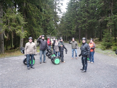 Auf Asphalt stürzen wir die nächsten zwei km wieder zu Tale, das geht verdammt in die Beine und schnell weiche ich auf das Kiesbankett aus, das ist immer noch besser als die knüppelharte Straße. Zur Belohnung gibt’s bei Halbzeit wieder Atzung, ich schleime mich heute so richtig ein. Die entgegenkommenden Wandergruppen feuern uns dankenswerterweise alle an, das tut gut und hilft, die harte Strecke zu verdrängen. Eine Gruppe Sagway-Fahrer beweist Humor, als ich sie zur Ordnung rufe, sie könnten ja wenigstens anbieten, uns zum Ziel zu fahren. Und dann ist sie schon wieder da, meine kleine Hexe, und schwebt auf ihrem Besen gen Tal. Mein lieber Mann, das sieht gut aus, da komme ich alter Knacker nicht hinterher. Glücklicherweise dürfen wir nach etwa zwei km den Asphalt zugunsten eines Naturwegs verlassen.