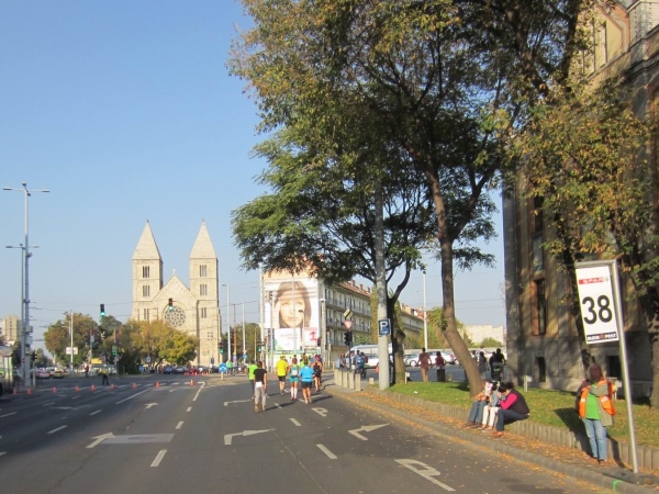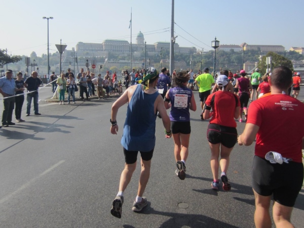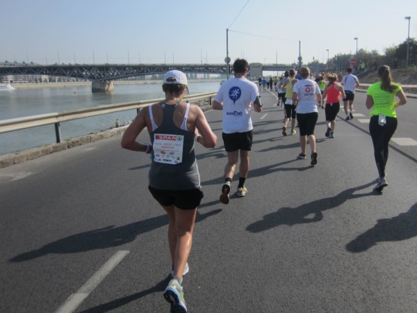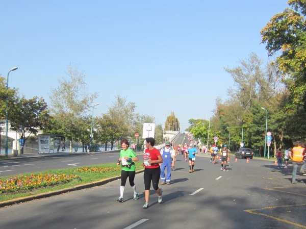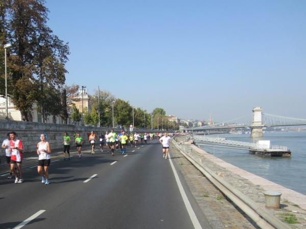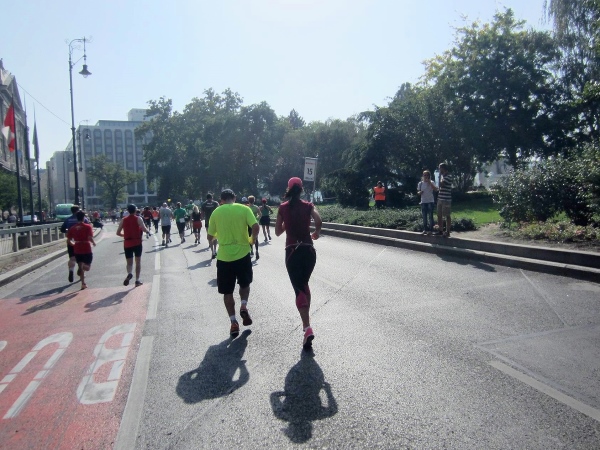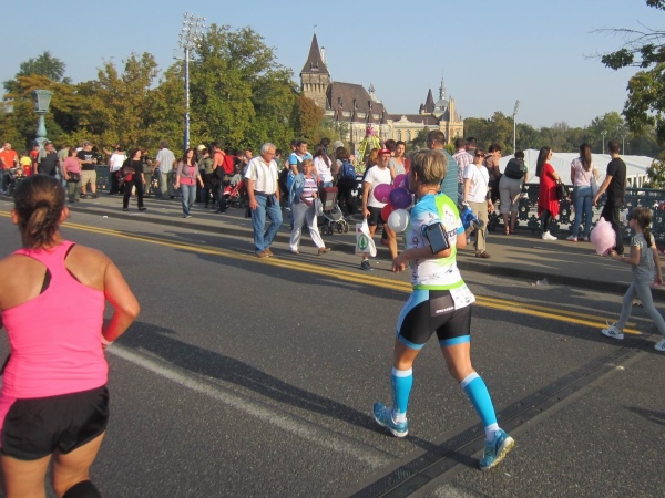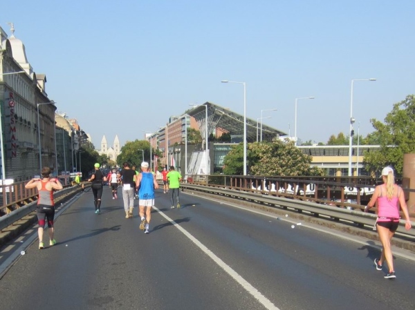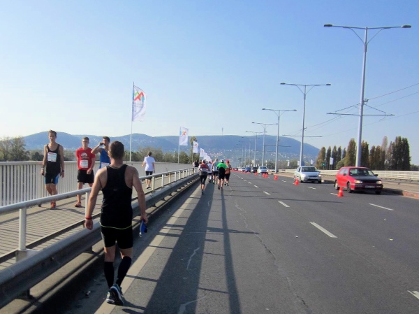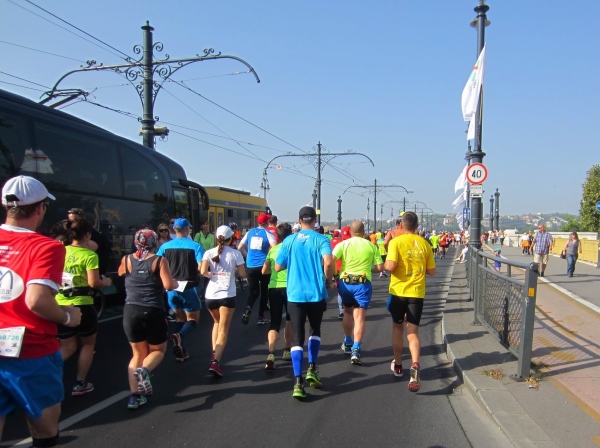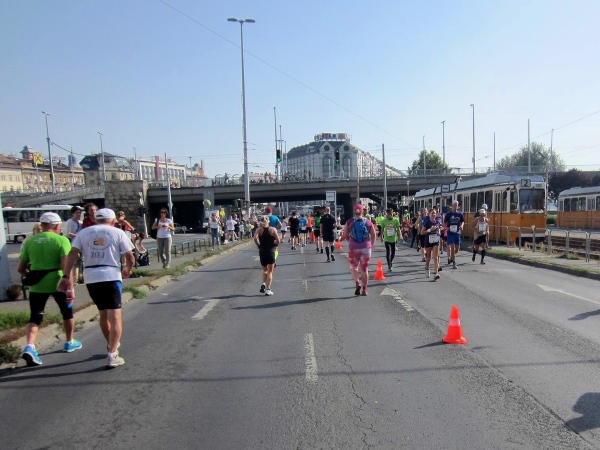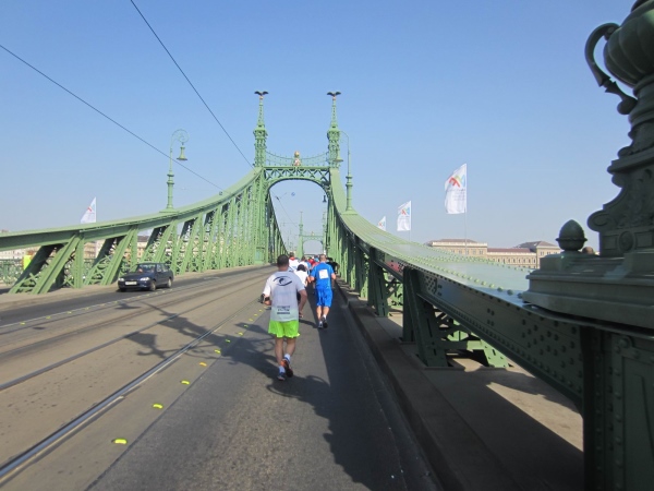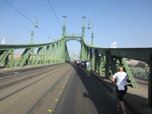 Ich frage einen von zwei vor mir laufenden Running Ambassadors aus Rotterdam, welche Message sie überbringen. „Die gute Laune“, antwortet der Mann. Laufen macht Spaß, ich glaube ihm. Wir nähern uns der Donau (Duna), dank der vielen Zuflüsse auf ihrem Weg zum Schwarzen Meer zu einem 300 m breiten Strom gewachsen, und kommen zur Margaretenbrücke (Margit híd), eine von neun erhaltenen Donaubrücken in Budapest. Sie verläuft über die Südspitze der Margareteninsel (Margit-sziget), auf die der Marathonkurs bei Kilometer7 auf der Brücke abzweigt. Die Insel ist 2,5 km lang und hat eine Fläche von 0,965 km². Dank der ausgedehnten Parkanlagen ist sie sowohl bei Touristen als auch bei der Budapester Bevölkerung als Erholungsort beliebt. Nur Taxis, Busse und Rikscha-ähnliche Fahrräder sind auf der Insel erlaubt.