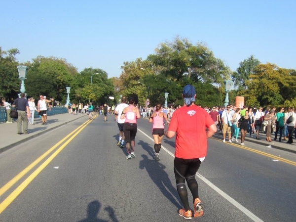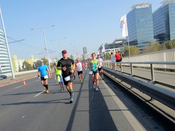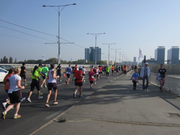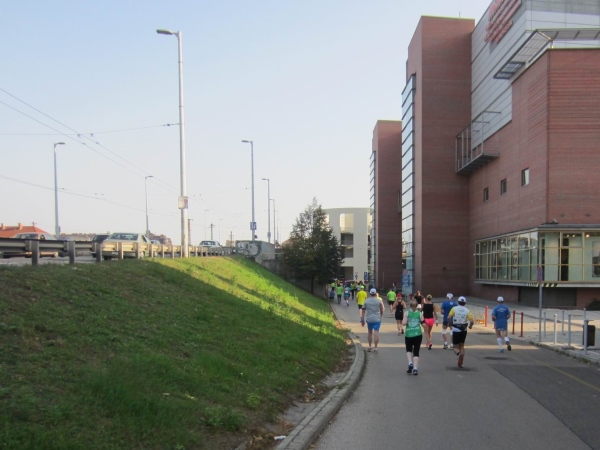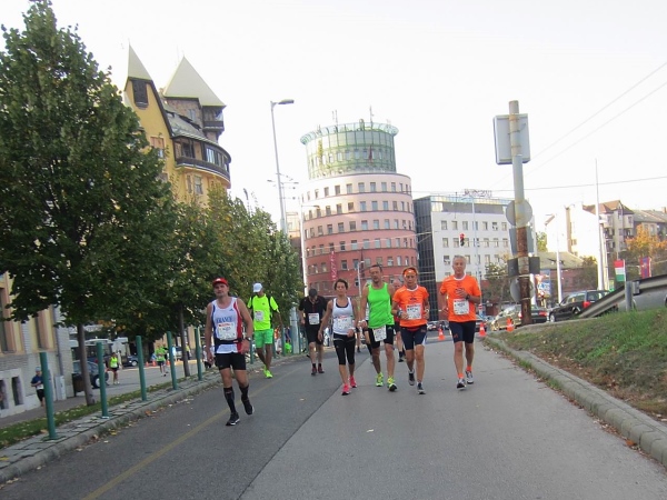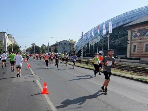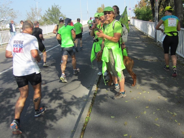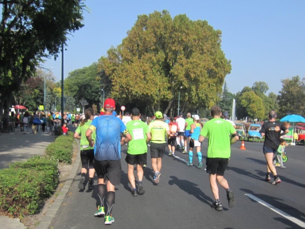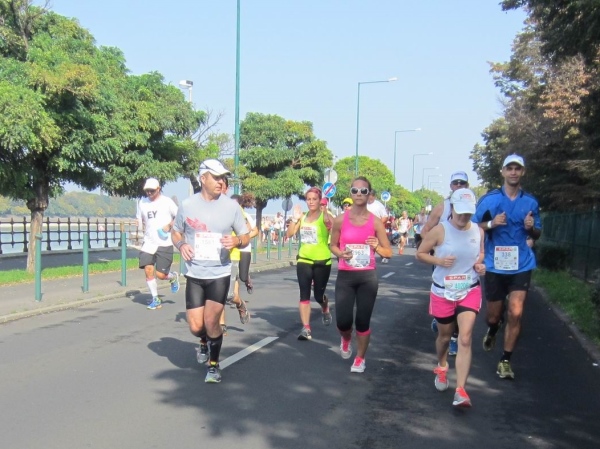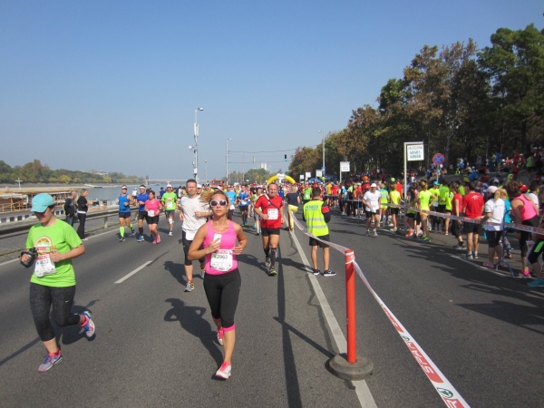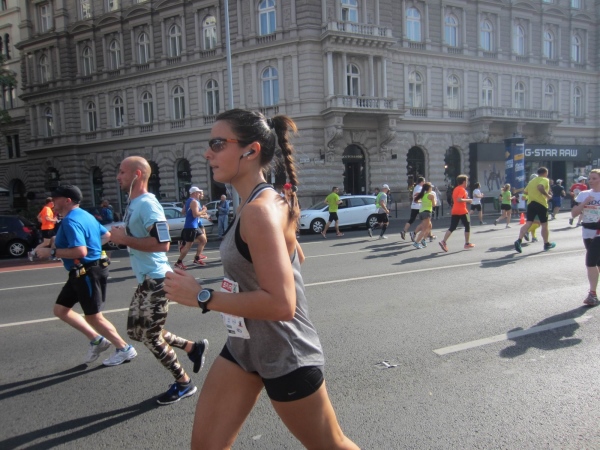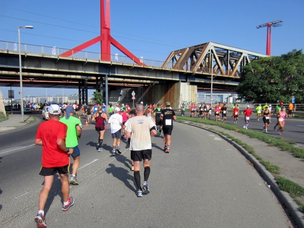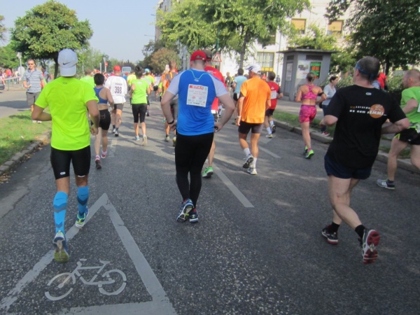 Ich frage einen von zwei vor mir laufenden Running Ambassadors aus Rotterdam, welche Message sie überbringen. „Die gute Laune“, antwortet der Mann. Laufen macht Spaß, ich glaube ihm. Wir nähern uns der Donau (Duna), dank der vielen Zuflüsse auf ihrem Weg zum Schwarzen Meer zu einem 300 m breiten Strom gewachsen, und kommen zur Margaretenbrücke (Margit híd), eine von neun erhaltenen Donaubrücken in Budapest. Sie verläuft über die Südspitze der Margareteninsel (Margit-sziget), auf die der Marathonkurs bei Kilometer7 auf der Brücke abzweigt. Die Insel ist 2,5 km lang und hat eine Fläche von 0,965 km². Dank der ausgedehnten Parkanlagen ist sie sowohl bei Touristen als auch bei der Budapester Bevölkerung als Erholungsort beliebt. Nur Taxis, Busse und Rikscha-ähnliche Fahrräder sind auf der Insel erlaubt.