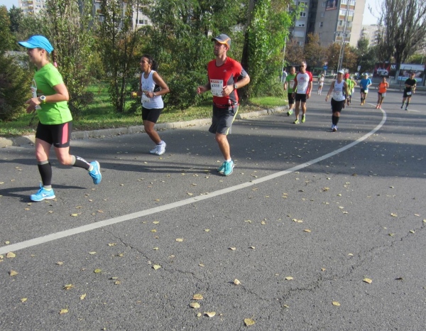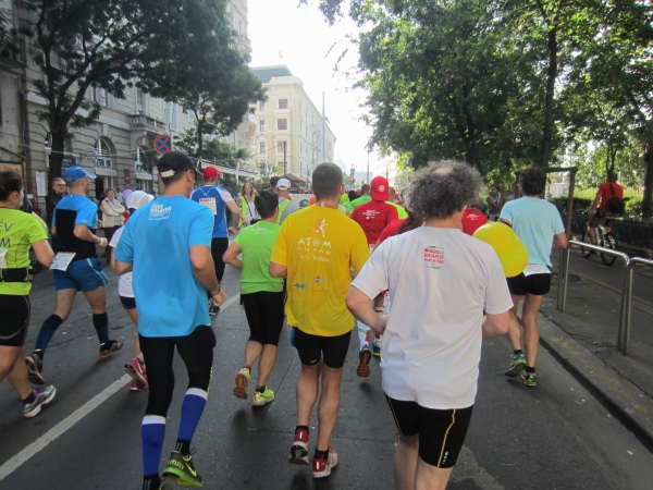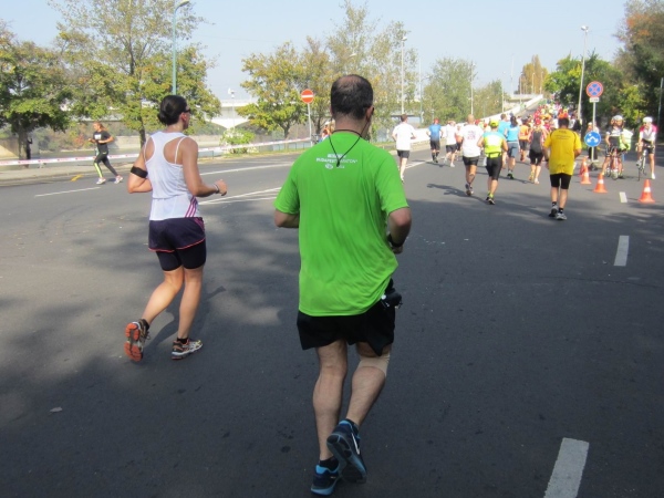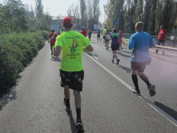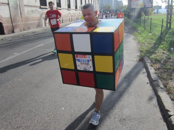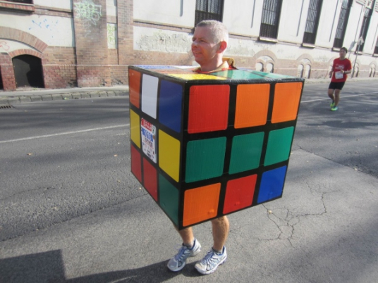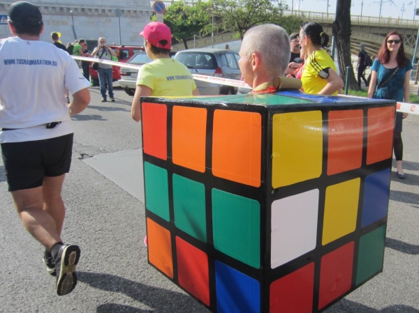 Bei Kilometer 12,195 passieren wir den Startpunkt für die 30km-Läufer, deren Lauf um 11.45 begann und die nur die ganz schnellen Marathonläufer beim Start gesichtet haben. Dass viele dann zurückfallen und wieder eingeholt werden, ist nicht ungewöhnlich. Auf der Höhe der Margaretenbrücke knapp nach Kilometer 13 folgt die nächste, inzwischen 3. Versorgungsstelle. Von hinten kommend überholt mich István Kocza, den ich bisher bei jedem Budapest Marathon mit angeschnalltem Rubik- Zauberwürfel im Läuferfeld antraf. István ist schon fast so bekannt wie der Erfinder des Würfels. Der ungarische Designer Ernö Rubik erfand den Würfel 1974. Anfang der 80iger Jahre wurden etwa 100 Millionen Cubes in aller Welt verkauft, bis heute sind es fast 400 Millionen Stück. Rubik selbst wurde damit allerdings nicht reich, wie er in Interviews gerne betont, sondern die den Würfel produzierenden Firmen.