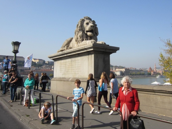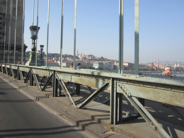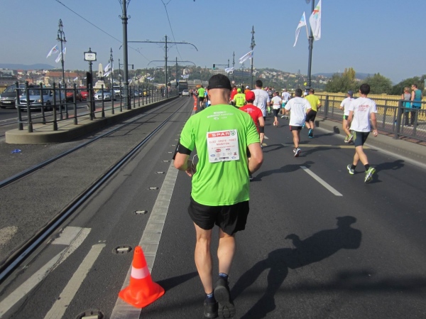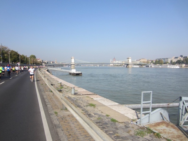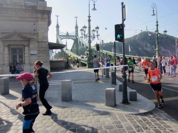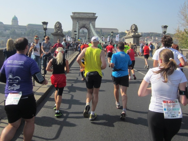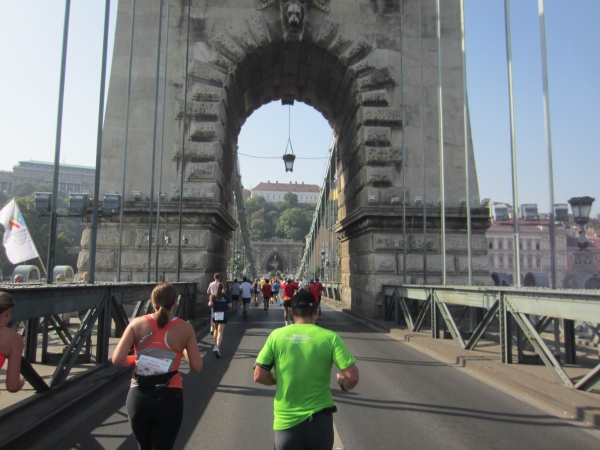 Bei Kilometer 15 wird ein Höhepunkt des 29. Budapester Marathons erreicht. Der Kurs führt über die berühmte Kettenbrücke (Széchenyi lánchíd) wieder auf die andere Donauuferseite nach Buda. Diese Hängebrücke wurde in der Zeit von 1839 bis 1849 auf Anregung des ungarischen Reformers Graf István Széchenyi erbaut. Das klassizistische Bauwerk wird von zwei triumphbogenartigen Stützpfeilern getragen, durch die die eisernen Ketten des 375 Meter langen Brückenkörpers verlaufen. Sie verbindet den István-Széchenyi-Platz (Széchenyi István tér, früher Roosevelt tér), der den Abschluss der Pester Innenstadt bildet, mit dem Adam-Clark-Platz (Clark Ádám tér) vor dem Budaer Burgberg. Die Pfeilertore haben eine Durchgangsbreite von 6,50 Meter, das Gewicht der Eisenkonstruktion wird mit 2.000 Tonnen angegeben. Viele Läufer bleiben kurz stehen und machen mit dem mitgeführten Smartphone einen Schnappschuss. Einer bietet sich an, auch von mir ein Foto mit meiner Digicam zu machen. So bin auch ich wieder einmal auf einer Laufstrecke im Bild.
