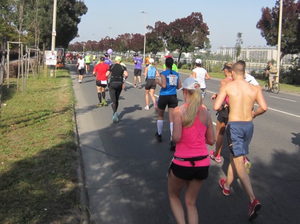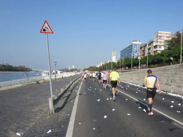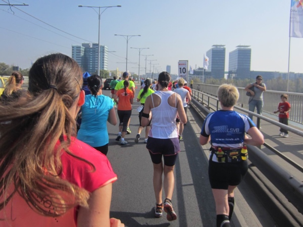 Nach ca. 8 ½ km folgt auf der Margareteninsel die 2. Labestelle, an der es Wasser, Iso, Bananen und Traubenzucker in Tablettenform gibt. Das Anfangsgedränge wie bei jedem größeren Marathon mit einigen tausend Startern, wenn die meisten zum ersten Tisch hinrennen, umgeht man am besten so, dass man gleich einige Meter weiterläuft oder die Seite wechselt. Bisher ist der Marathonkurs auf teilweise gut erhaltenen Asphalt verlaufen.