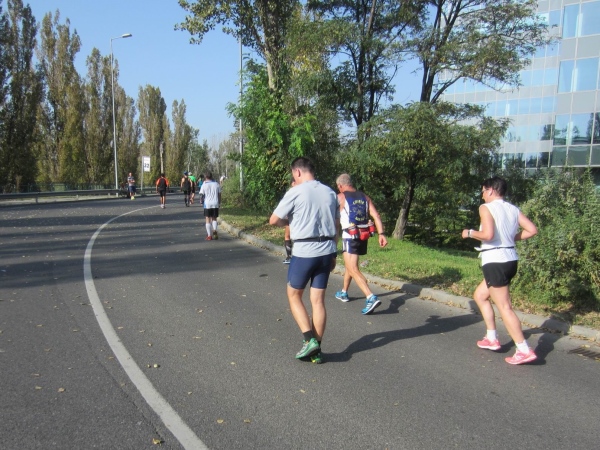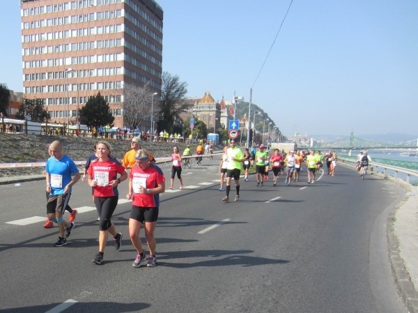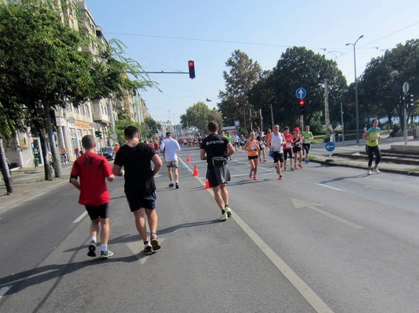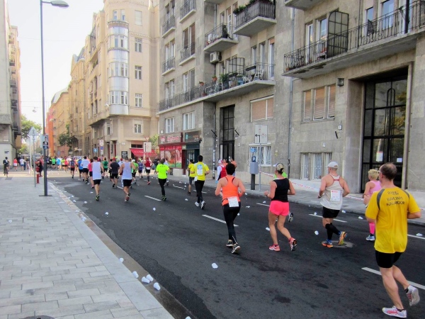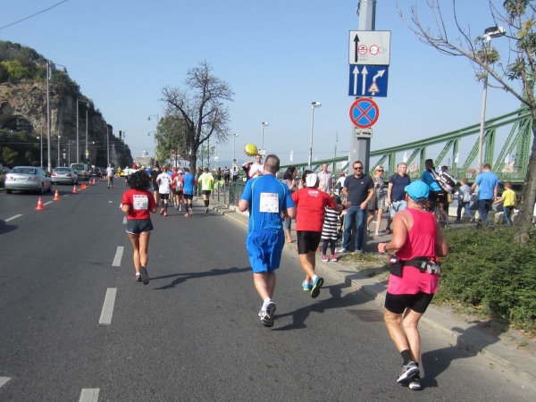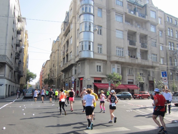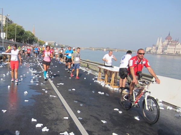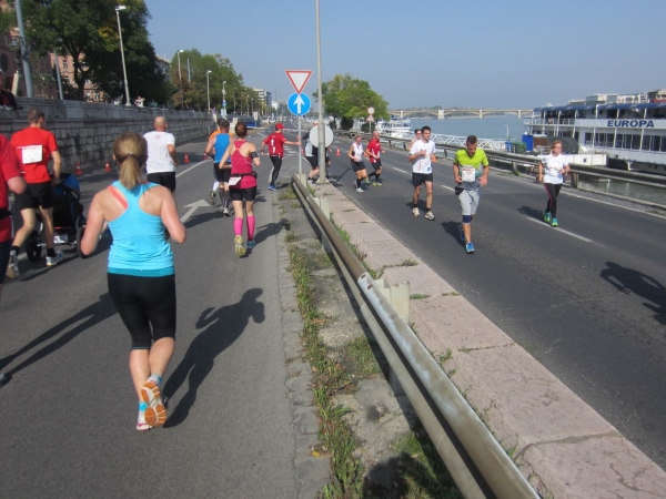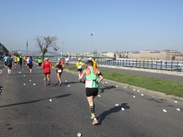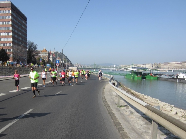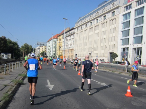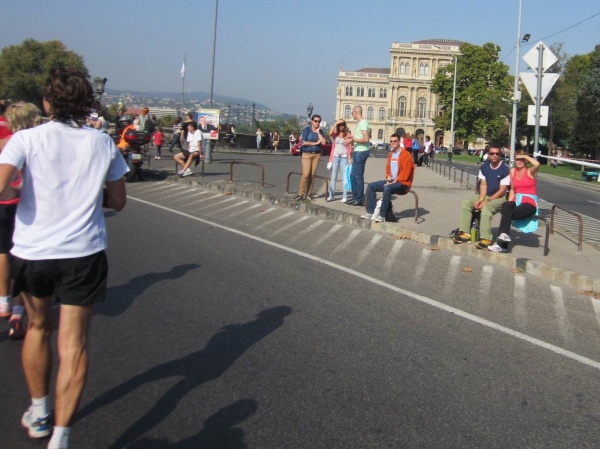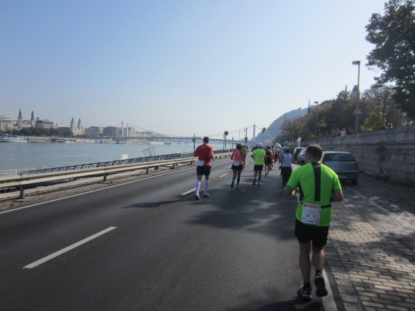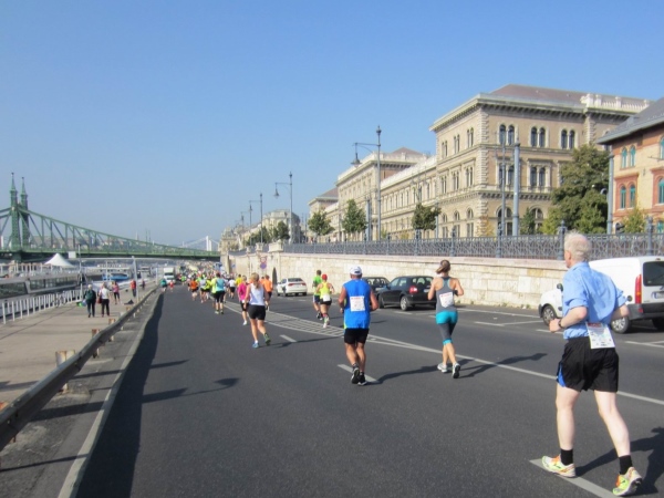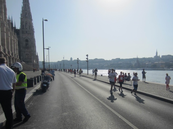 Beim Fővám tér gleich nach der Freiheitsbrücke auf der Pester-Seite bei Kilometer 25 verläuft der Marathonkurs die Közraktár utca wieder einen Kilometer stromabwärts. Dann wird gewendet und es geht auf der gleichen Straße der Sonne entgegen, die unerbittlich von Südwesten einstrahlt. Die Strecke über mehrere Kilometer am Kai entlang ist zwar flach und bietet ein tolles Panorama, aber es hat laut einem Sanitäter 28 Grad C. Man sieht Läufer auf der Kaimauer sitzen, andere haben sich einfach auf die Straße gelegt, einen Bewusstlosen erblicke ich auch, der Notarzt kümmert sich um ihn.