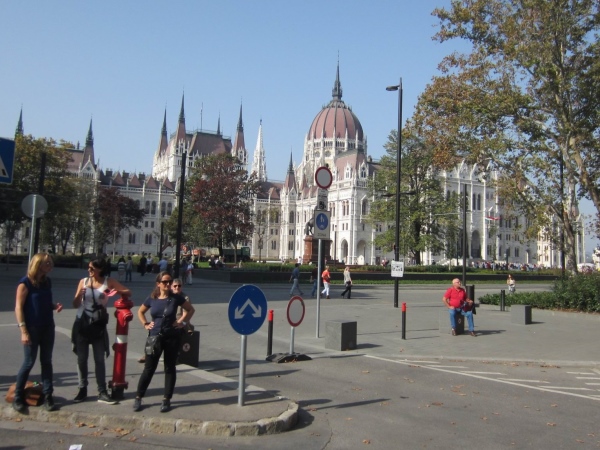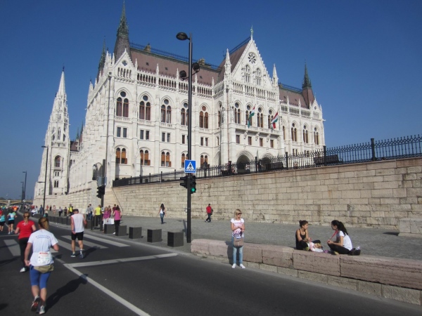 Die Marathonstrecke führt weiter zum Kossuth Lajos Platz und nach ca. 14 km auf der Rückseite des ungarischen Parlaments (Országház) vorbei. Das im neogotischen Stil in den Jahren 1885 bis 1904 errichtete 268 m lange Gebäude mit einer 96m hohen Kuppel liegt direkt am Donauufer und ist eines der Wahrzeichen Budapests. Als architektonisches Vorbild diente der Palace of Westminster, der Sitz des britischen Parlaments in London. In der Kuppelhalle wird die Stephanskrone als Nationalheiligtum Ungarns aufbewahrt.