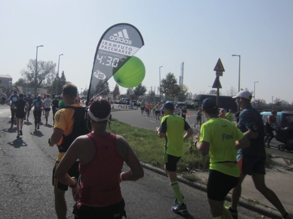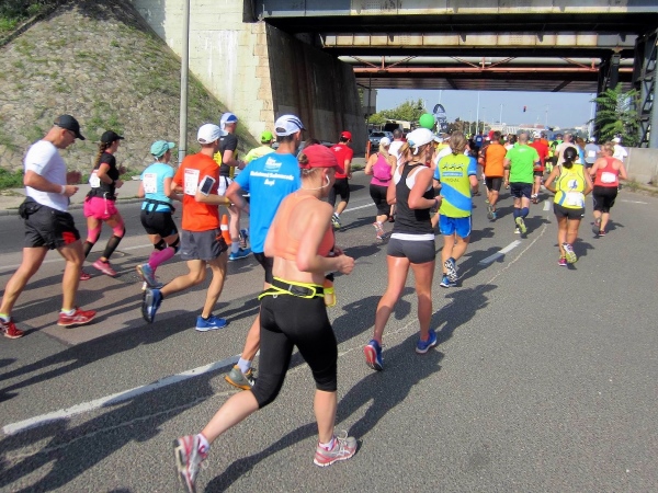 Knapp danach folgt die 5. Versorgungsstation. Ich öffne ein Sponser-Gelpäckchen und spüle es mit einem Mix aus Wasser, Iso und Cola hinunter. Nach 2 Stunden Laufzeit und knapp 20 km spüre ich, dass heute meine Kondition zu wünschen übrig lässt. Auf der ganzen Strecke findet sich keine schattige Passage. Einige Läufer pressen sich an die Kaibetonwand an, um der westlich stehenden Sonne abschnittsweise auszuweichen. Ich blicke über die Schulter zurück, der 4:30er-Pacemaker nähert sich mit zwei Dutzend Läufern im Gefolge. Die Gruppe zieht an mir bei der 21 km-Wende vorbei.