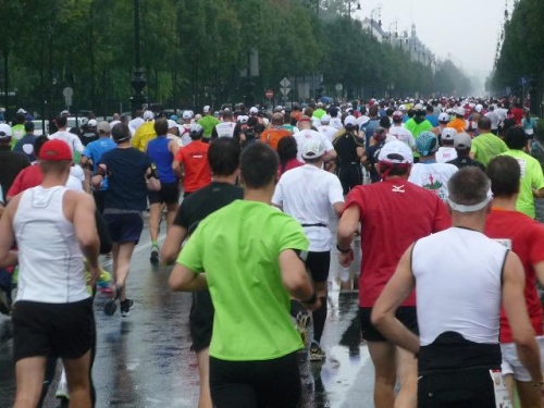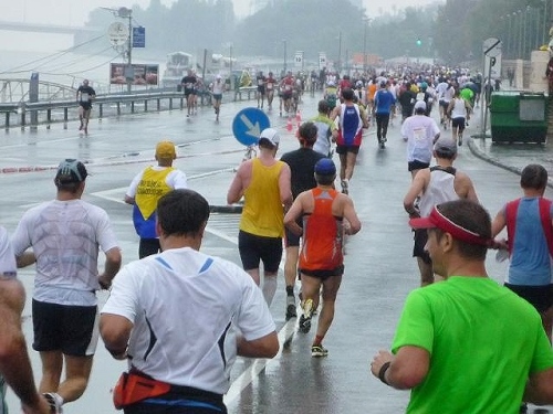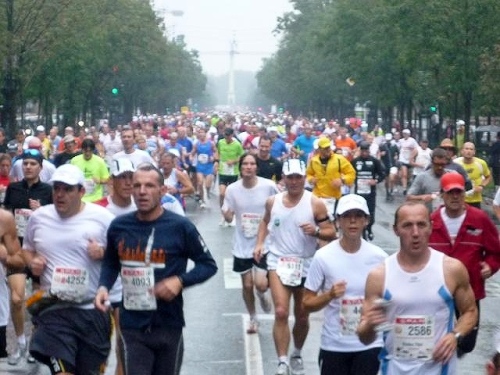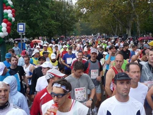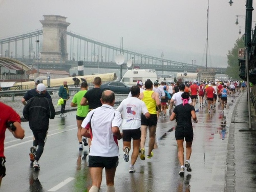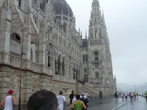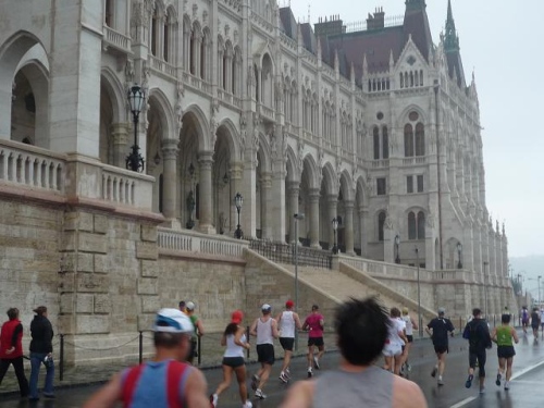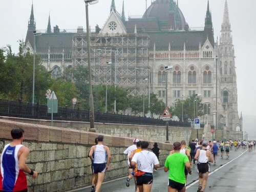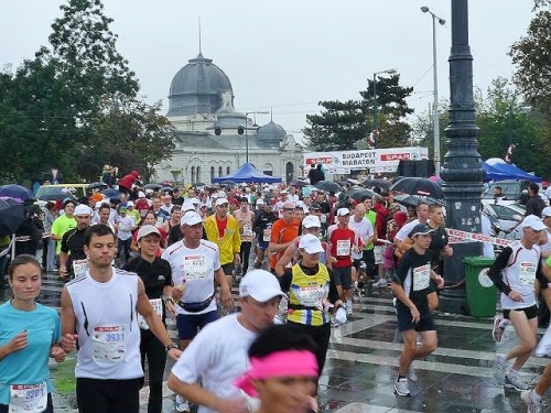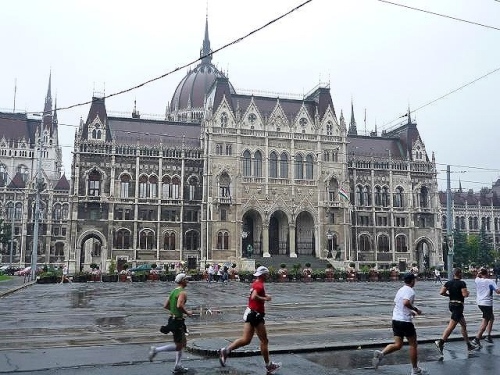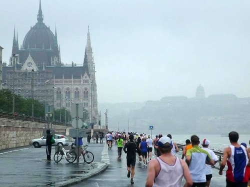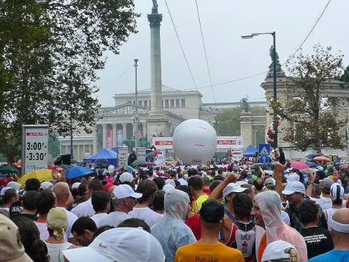 Wie schon fast zu erwarten war: Zehn Minuten vor dem Start heißt es „Wasser marsch“. Die Wolken entlassen ihre nasse Fracht und wir bekommen einen ersten Vorgeschmack darauf, wie es sich anfühlt, sich knapp bekleidet und gut durchfeuchtet fortzubewegen. Zum Glück ist es aber nicht kalt. Der prächtigen Stimmung unter den Läufern tut dieser Himmelsgruß aber keinerlei Abbruch. Trommler und ein Moderator heizen die Stimmung kräftig an, man merkt den Läufern förmlich an, dass sie ganz heiß darauf sind, endlich starten zu dürfen. Der ungarische Präsident Pál Schmitt höchstpersönlich ist es, der um Punkt 10 Uhr den erlösenden Startschuss abfeuert und die johlende Meute auf die Strecke entlässt.