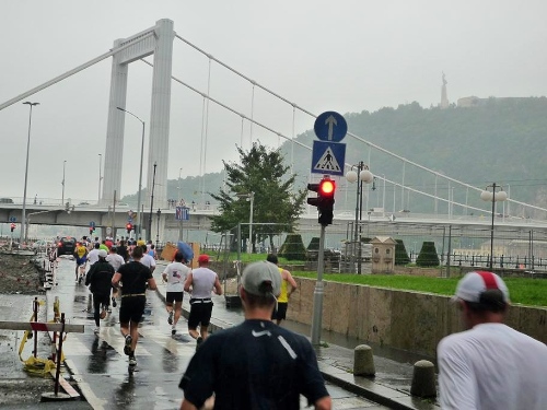 Auf Höhe der nächsten Donaubrücke, der Margit hid (Margaretenbrücke) kurz nach km 8, erwartet uns die nächste Verpflegungsstation, nun mit dem Vollprogramm, d.h. neben Wasser halten die wetterfesten Helfer Elektrolytgetränke, Bananenstücke, Zitronenscheiben und Traubenzucker bereit. Wie im Vorjahr verhindern weiterhin Brückenrenovierungsarbeiten, dass sich der Streckenverlauf ab hier über die Brücke und sodann im Naturidyll der Margaretheninsel fortsetzt – voraussichtlich im nächsten Jahr wieder, meint Renndirektor Arpad Kocsis. So folgen wir der Donau weiterhin auf der Festlandseite.