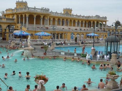 Eine alternative Entspannungsmöglichkeit hält gerade bei diesem garstigen Wetter das nahe Széchenyi-Thermalbad bereit. Die Bäder dieses größten, 1881 in Betrieb genommenen Budapester Thermalbads werden aus einem 976 m tiefen Brunnen gespeist. In 20 verschieden temperierten Becken kann man dem gepflegten Nichtstun frönen oder in einer der zahlreichen Saunen oder Dampfbäder schwitzen. Der größte Andrang herrscht allerdings in den großen Außenbecken. Und dort ist es auch am schönsten. Beim Anblick der die Becken umschließenden gelbgetünchten alten Gemäuer fühlt man sich wie in eine überdimensionale toskanische Landvilla versetzt. Auf alle Fälle ist es einfach göttlich, im warmen Wasser liegend die geschundenen Beine baumeln und sich von den Wasserdüsen massieren zu lassen.