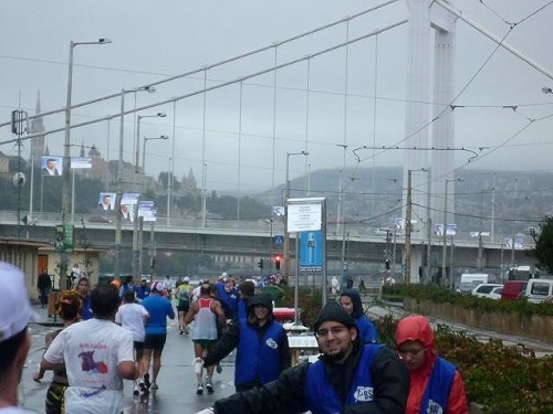 Auf den mittleren, abgesperrten Fahrbahnen der vielspurigen Váci út setzen wir den Lauf fort. Die linke und die rechte Außenspur ist für den Verkehr geöffnet. Während wir jede Menge Freiraum haben, quälen sich die Autos langsam über ihre Spur. Ein eigenartiges Gefühl ist dies, zumal die Läufer nur vereinzelt dahin tröpfeln. Aber irgendwie genieße ich auch dieses Privileg. Wenig später zweigen wir polizeigesichert in ruhigere Seitenstraßen ab. Allzu viel nehme ich von dem, was um mich herum vorgeht, nun nicht mehr wahr. Genug des Laufens, genug des Regens - ich will nur noch eines: ins Ziel. Aus meiner Lethargie erwache ich erst wieder, als vor mir endlich der Heldenplatz auftaucht. Eine letzte Kurve drehen wir noch durch das Stadtwäldchen, dann geht es auf der Zielgeraden dem Zielbogen auf dem Felvonulasi-Platz entgegen.