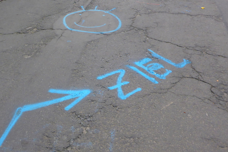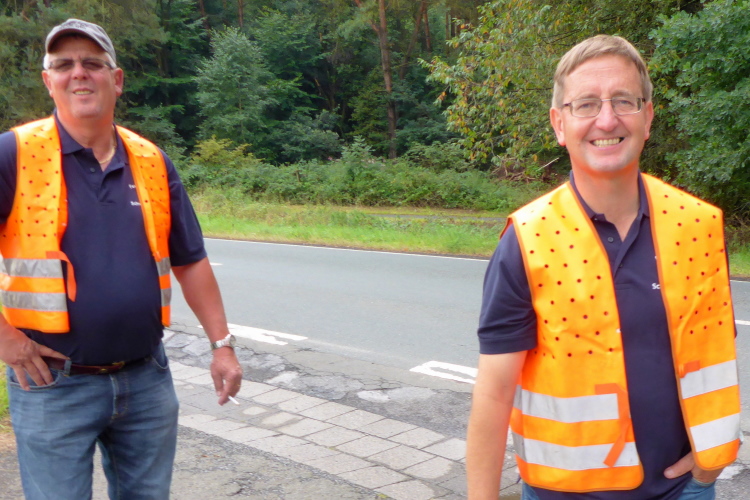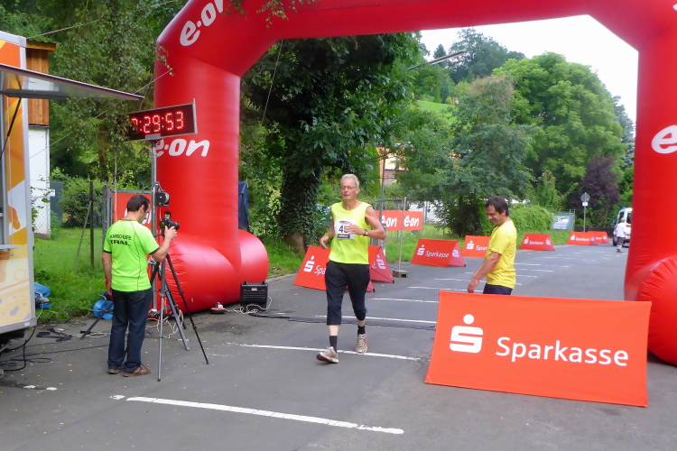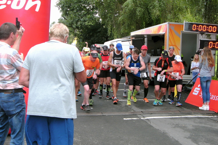Mit dem „Go!“ der Zeitmesser werde ich kurz nach 10 Uhr vom Moderator herzlich verabschiedet. Es geht die Straße „Am Schwimmbad“ entlang und dann scharf rechts auf den ersten Anstieg. Ohne den Antrieb eines davoneilenden Feldes will ich mich auch nicht quälen und mache langsam. Es geht steil bergauf. Deshalb ist es auch kein Problem, dass mich zweimal anreisende Läufer nach dem Weg fragen. Ich bin sowieso am Gehen. Dann erreiche ich die Hauptstraße. Heinz Kaletsch hatte mich eindrücklich gewarnt, dass hier noch kein Streckenposten stehen würde und die Autos Vorrang hätten. Ich steuere also auf den Fußgängerüberweg zu, da hält bereits das erste Auto und winkt mich hinüber. Sehr nett.
