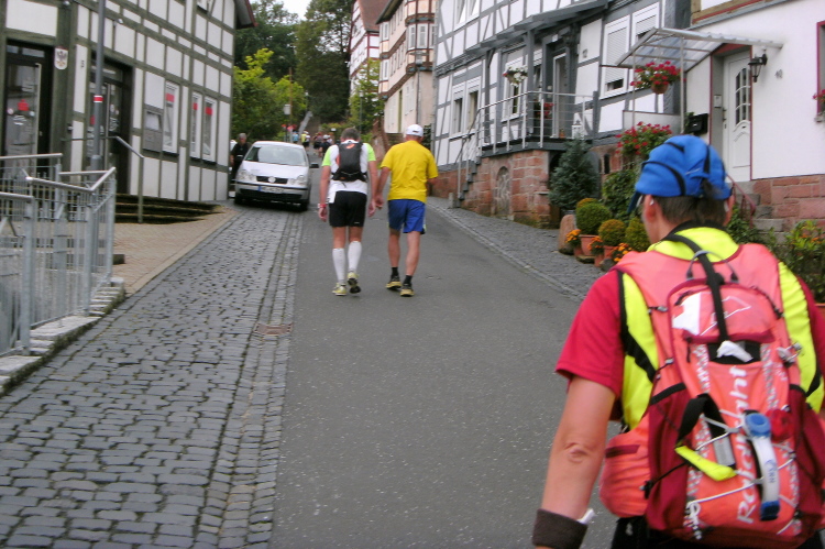 Wieder auf den Feldern, geht es am Waldrand steil bergab. Unten stehen Streckenposten extra für mich bereit. Sie ermöglichen mir eine ungefährdete Überquerung der B3. Vielen Dank. Zunächst stark trailig, dann aber auf breitem Wanderweg jogge ich weiter. Dann kommen mir plötzlich Läufer entgegen. Um keine Verwirrung zu stiften, rufe ich schon weitem, dass sie richtig seien und ich nur wegen meines Frühstarts bereits auf dem Rückweg bin. Auch Norbert ist schon hier. Kurzes Abklatschen, dann geht es für mich geradeaus. Der Waldweg wird zum Feldweg. Dieser mündet auf eine asphaltierte Straße, die bergauf geht. Oben leiten mich Schilder auf einen Wiesenweg zum Waldrand. Zwischen Wald und Weidezaun geht es entlang. Bald kann ich Rauschenberg unter mir liegen sehen.