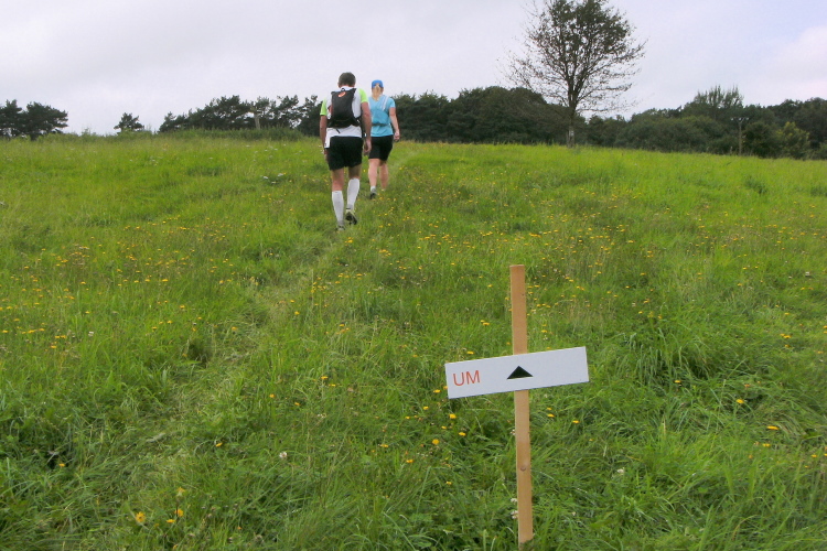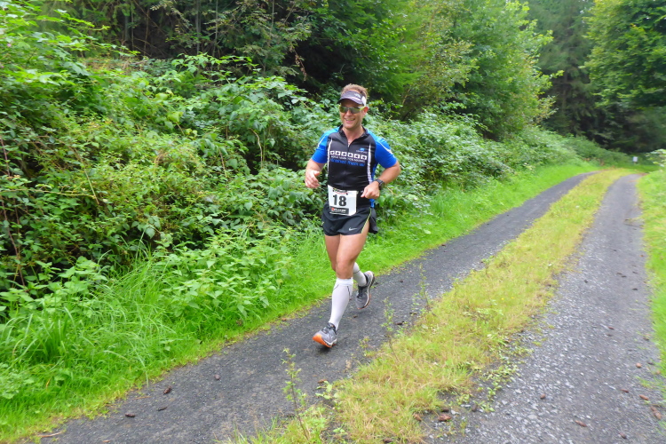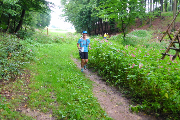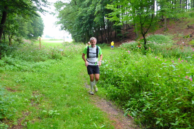 Gut versorgt mache ich mich auf den Weg. Der Wald wird nun licht. Es ist fast 16 Uhr und die Sonne knallt. Km 13, 12,11. Um mich herum blüht es in unterschiedlichsten Farben. Es summt, brummt und zwitschert. Wenn meine Füße schneller wären, könnte alles perfekt sein. Km 10, hinter einer langgezogenen Rechtskurve geht es bergab. Unterhalb einer Wiese im Schatten hoher Bäume warten die Helfer der nächsten VP auf mich. Eine dunkle Wolke sieht für mich nach Gewitter aus. Die Einheimischen meinen, das wäre schon den ganzen Nachmittag so, und erinnern an das letzte Jahr, wo im Ziel später das Zelt weggeflogen ist. Für die nächsten Stunden ist Regen jedoch höchst unwahrscheinlich.