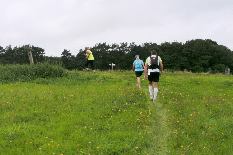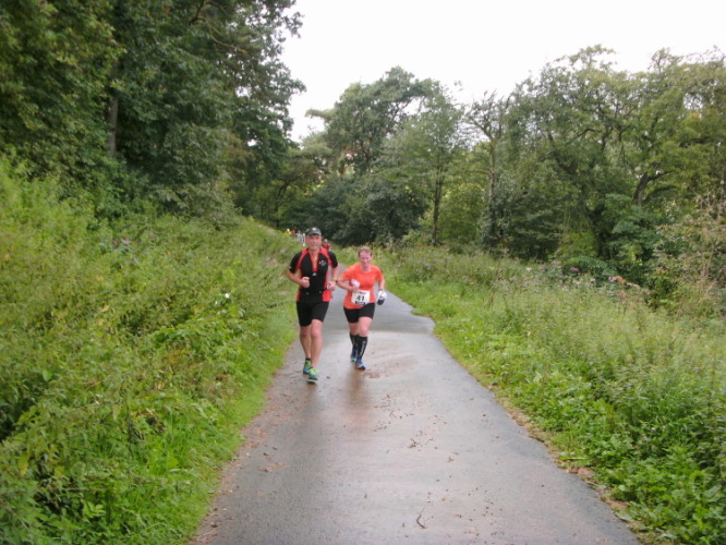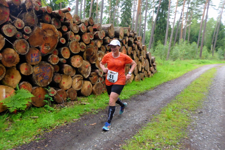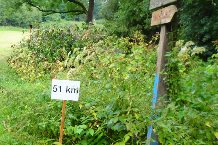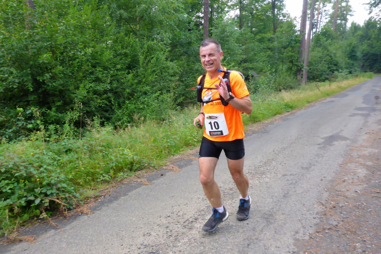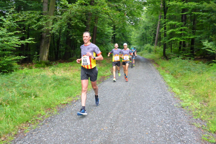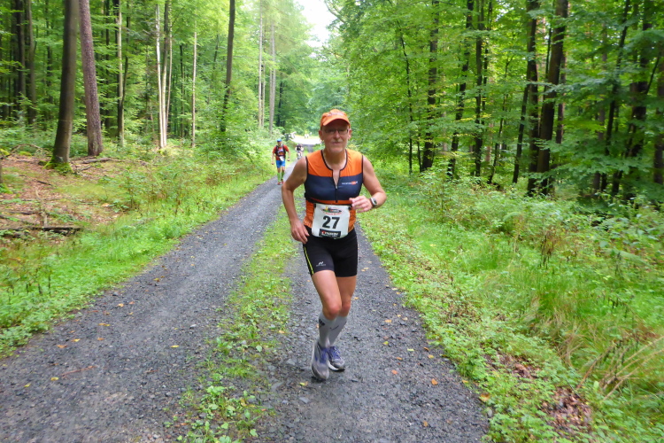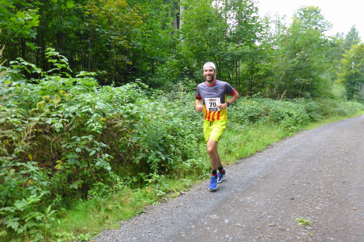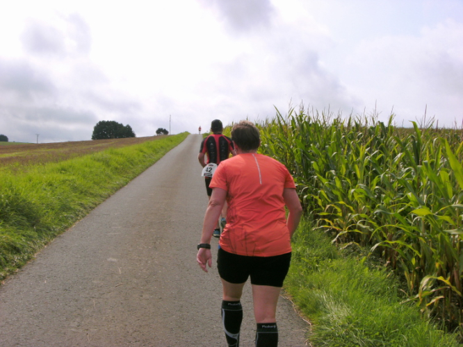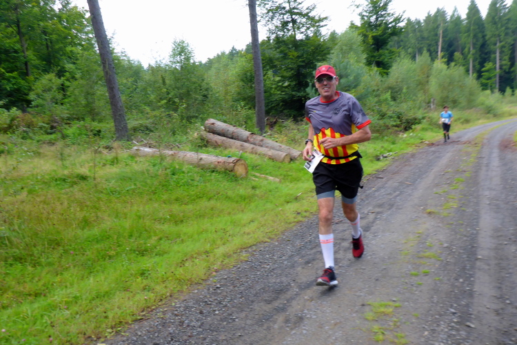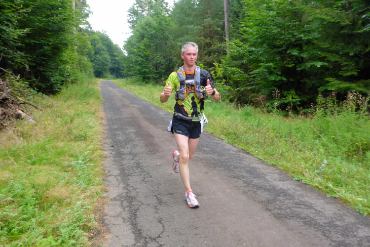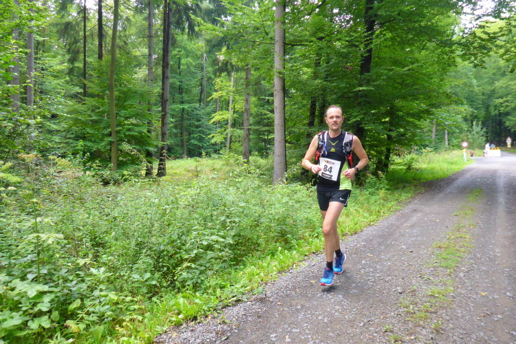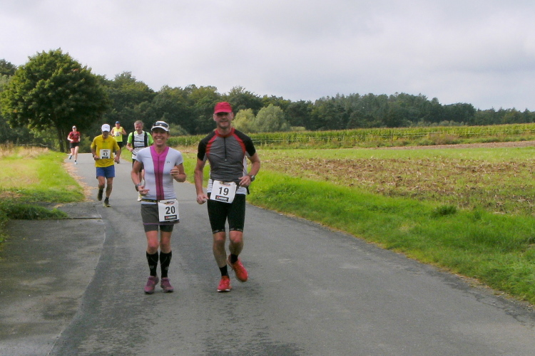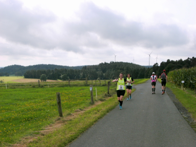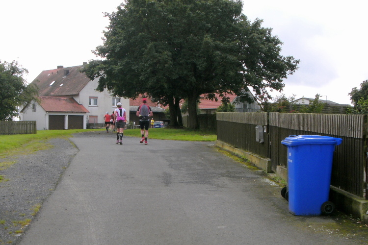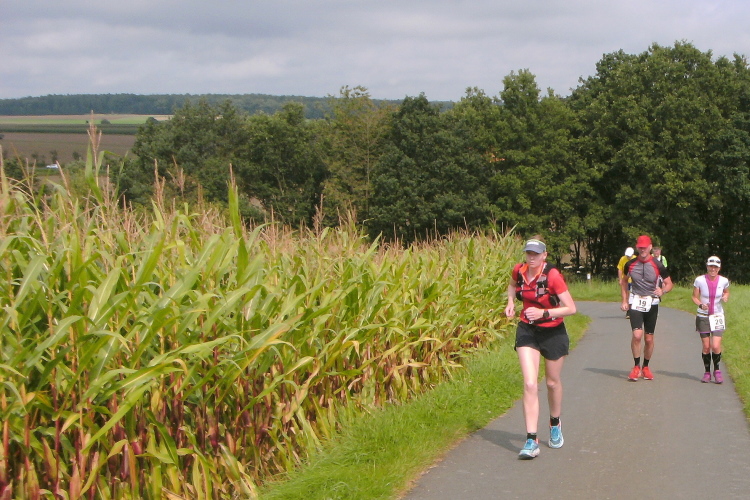 Ich bin froh, denn meine Flasche ist schon lange leer. Die Sonne kommt manchmal durch und die letzten Kilometer gab es kaum Schatten. Ich halte einen kurzen Plausch, bis mich die Ankunft eines weiteren Läufers zum Aufbruch mahnt. Wir verlassen Albhausen auf einer asphaltierten Straße Richtung Wald. An diesem geht es nun entlang. Es sind noch 35 km bis ins Ziel. Immer mehr Läufer holen mich jetzt ein und ich versuche, den einen oder anderen abzulichten.