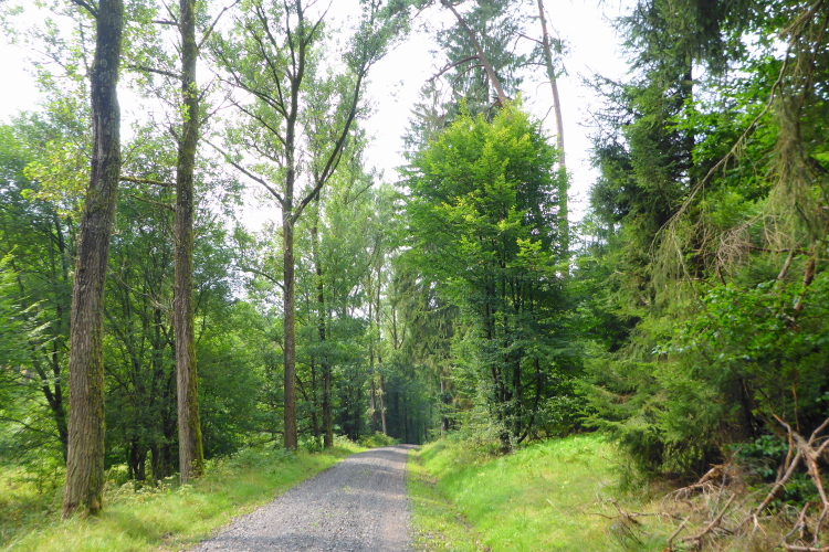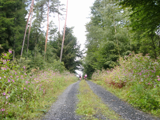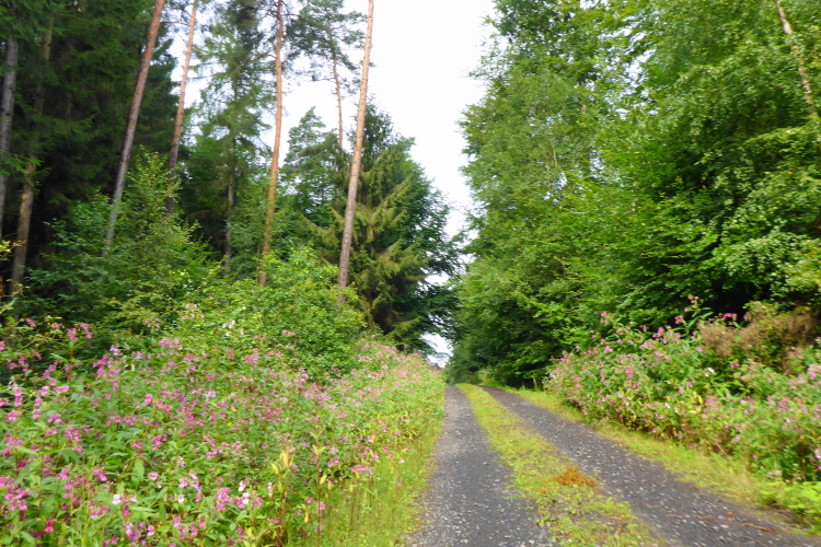 Nach 2 Kilometern biegen wir in den Wald ein. Auf Schotter geht es weiter. Mir ist heiß und ich überlege ernsthaft, das kleine Bächlein neben mir zur Kühlung zu nutzen. Das Wasser ist allerdings unappetitlich braun. Es handelt sich um einen Abfluss der Moorwiesen und wird als „rotes Wasser“ bezeichnet. Ich kann mich damit nicht anfreunden und schwitze lieber weiter.