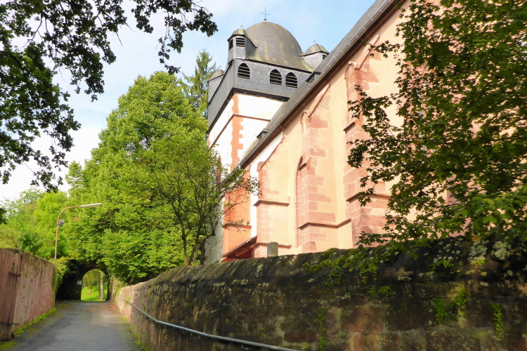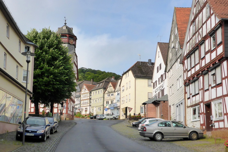 Auf der anderen Straßenseite erwartet mich das hervorragend restaurierte Rathaus aus dem 16. Jahrhundert, in dem sich immer noch die Stadtverwaltung befindet. Im Vorbeilaufen bewundere ich die feinen Reliefs, mit denen der achteckige Treppenturm verziert ist. Inzwischen gehen die Rauschenberger ihren Samstagsbeschäftigungen nach. Doch alle wissen wohl, weshalb ich hier wandere und jeder hat ein aufmunterndes Wort für mich. Eine Anwohnerin erklärt mir, warum es hier so steil bergauf geht: „Rauschenberg liegt am B e r g“. Nun weiß ich das auch.