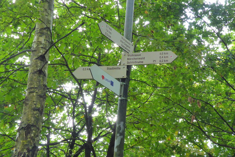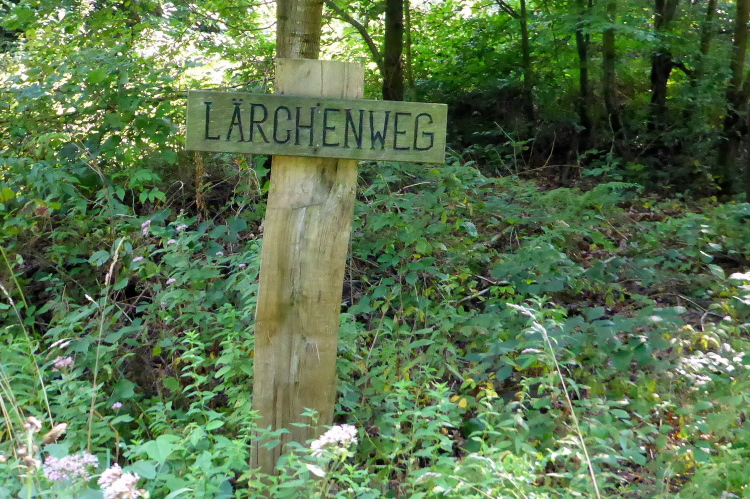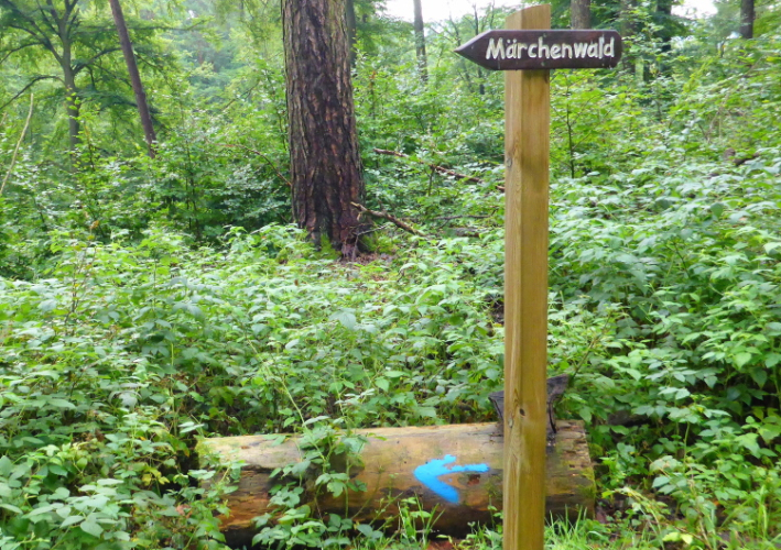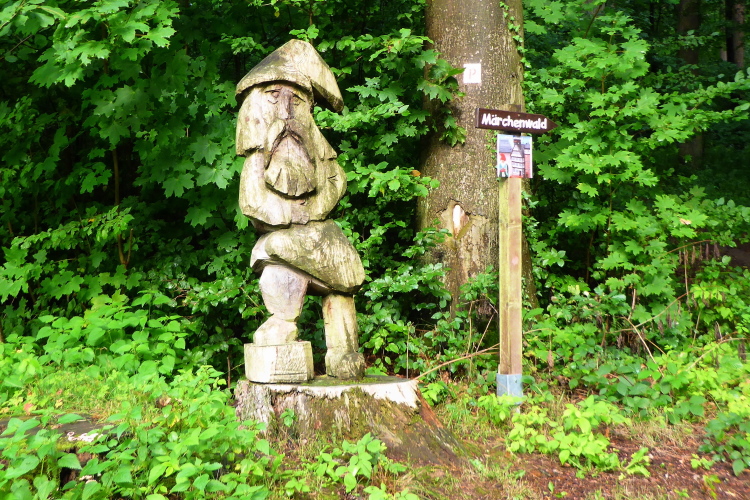 Mein Weg führt jetzt in den sogenannten Märchenwald. Wem Wald an sich nicht märchenhaft genug ist, kann sich am niedlichen Zwergendorf erfreuen. Am Waldspielplatz verlasse ich den Pfad. Auf breitem Waldweg geht es an einem Schachbrett, einer Boule-Bahn und einer Kneippanlage vorbei. Ein weiterer Pfad führt mich direkt oberhalb der Kreisstraße entlang. Kein Auto weit und breit, dafür einsame Ruhe. Irgendwo rauscht ein Bächlein und die Vögel singen nur für mich. Einfach himmlisch. Auf dem folgenden Wiesenweg bekomme ich nasse Füße, aber was soll es, hier gefällt es mir, so kann es weiter gehen.