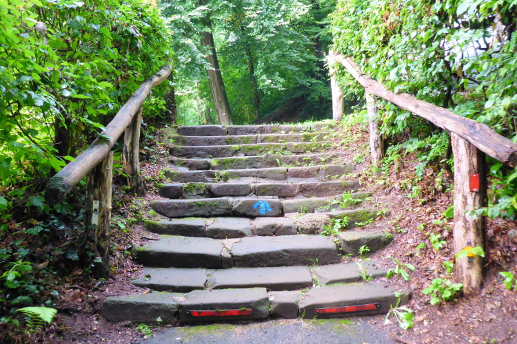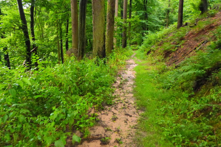 Nach der kompletten Umrundung der Ruine komme ich wieder an die Wegbiegung von vorhin. Nun geht es steil bergab. Leider kann ich es nicht so laufen lassen, wie ich gerne will. Ich habe Angst, die Richtungspfeile zu übersehen. Außerdem vermisse ich ein klein wenig meine Trailschuhe. Nach den ergiebigen Regenfällen der letzten Nacht ist der Pfad aufgeweicht und matschig.
