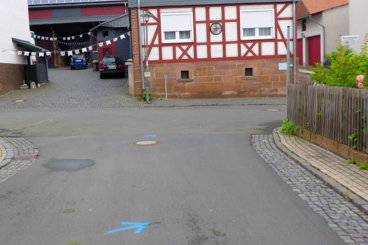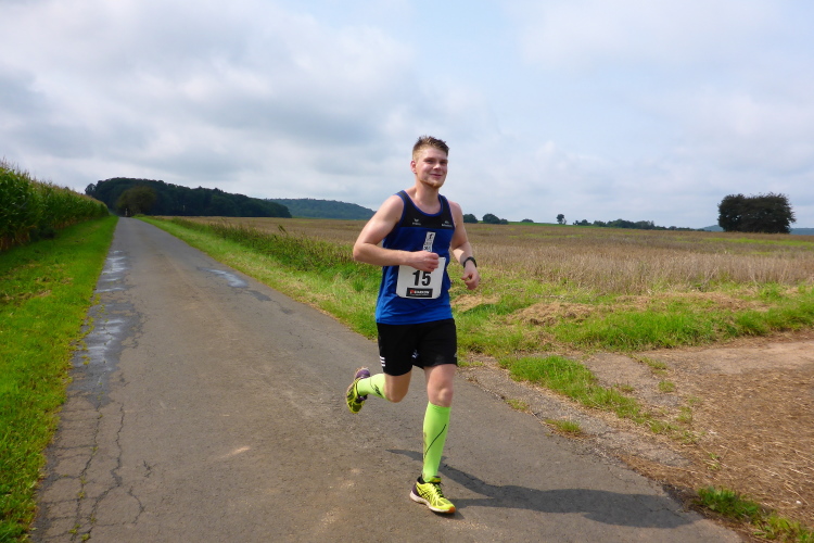 Im Zickzack geht es erneut nach Wolfskaute. Mir war vorhin gar nicht aufgefallen, dass auch Pfeile in die andere Richtung zeigen. Einmal der Länge nach durch den winzigen Ort und auf der anderen Seite den Berg hinunter. Das Gefälle ist lang und ich lasse es laufen. Janek Waldschmidt kommt von hinten, dicht gefolgt von Felix Junk. Beide nutzen ebenfalls das Gefälle, um etwas Tempo zu machen. Schnell erreichen wir Albhausen, wo wir von einigen Mädels an der Wasserstelle erwartet werden.
