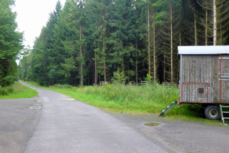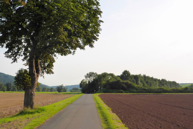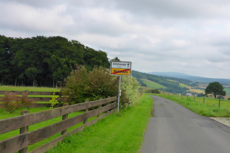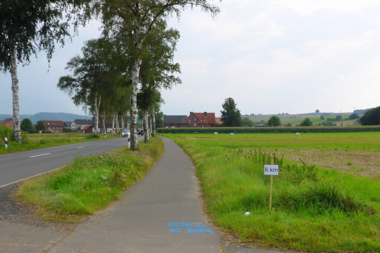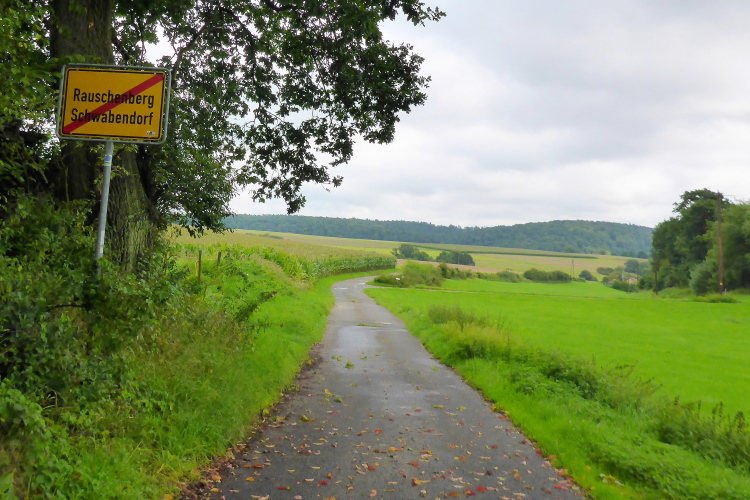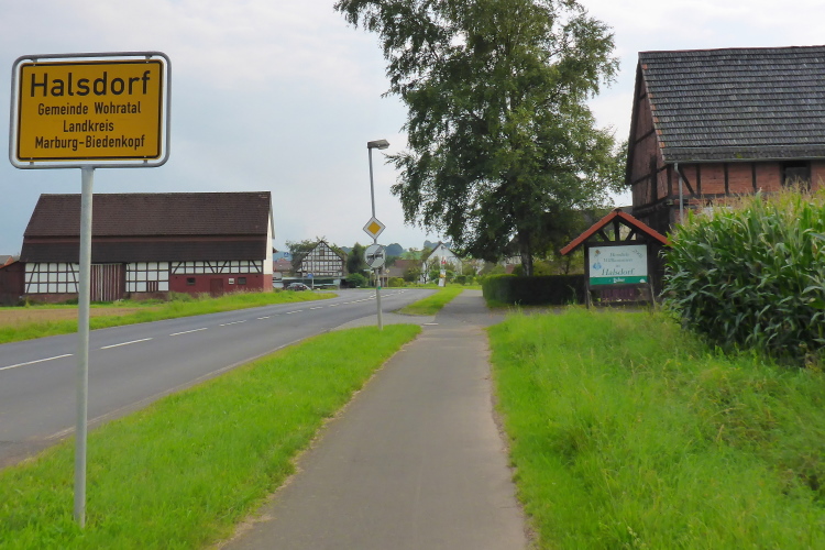 Die Auestrasse ist mehr ein breiter Radweg und flach. Der abwechslungsreichen Gegend sei Dank komme ich gut voran. Felder, Wiesen, dazwischen Gruppen von Hecken und Bäumen zeugen von reicher Kulturlandschaft. Bei km 4 liegt ein idyllischer Bauernhof. Hier spielen die Kinder noch auf der Straße. Links liegt der ehemalige Bahnhof von Ernsthausen. Die Wohratal-Kellerwald-Bahn ist schon lange stillgelegt und zurückgebaut. Hinter km 3 bewachen zwei riesige schwarze Hunde den Eingang zu einem Gutshof. Mit Hunden habe ich ja eigentlich keine Probleme, aber die sind hier scheinbar allein. Als ich näher komme, legen sich die zwei auf den Rücken und wollen gekrault werden. Das lasse ich aber lieber.