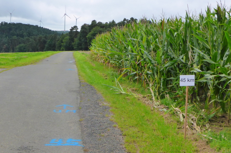 Ich folge nun den Markierungspfeilen Richtung Grillplatz oben auf dem Berg. Hier wollen Biker heute ein Fest veranstalten. Für mich geht es einmal um das Festzelt herum und auf der anderen Seite wieder steil bergab. Wann wohl der erste Ultra von hinten kommt? Ich habe noch knapp 40 Kilometer zu laufen, als ich abermals eine Höhe erreiche. Die Fernsicht von hier ist wirklich unbeschreiblich. Zwischen den grünen Maisfeldern sind andere Getreide bereits abgeerntet. Dazwischen Viehweiden und im Hintergrund der dunkle Wald. Menschliche Ansiedlungen scheint es rundherum nicht zu geben.