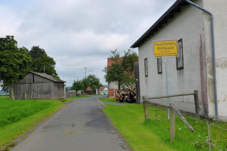 Bei der Hugenottengedächtnis-Kirche ist gerade ein Helfer dabei, die VP aufzubauen. Er bietet mir spontan Wasser an, aber ich bin noch versorgt. Ich hatte nicht mit einer Versorgungsstation gerechnet und daher selbst etwas zu trinken mitgenommen. Das ist auch gut so. Bei wolkenverhangenem Himmel ist es unglaublich schwül. Im Zickzack werde ich durch den Ort geleitet. Die nächsten 3 Kilometer führen wellig über die Felder bis zum kleinsten und mit 330 Hm zugleich höchstgelegene Stadtteil von Rauschenberg, genannt Wolfskaute mit 25 Einwohnern. Als 1699 diese Zweigstelle von Schwabendorf gegründet wurde, waren es noch über hundert.