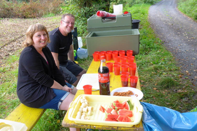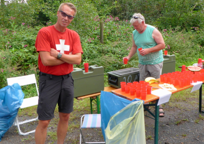 Die Kilometrierungen für 16,15 und 14 werden passiert da kommt die nächste VP in Sicht. Obwohl hier auch der Halbmarathon vorbei kam, gibt es noch die ganze Auswahl an Speisen und Getränken einschließlich Cola. Auch Salzbrezeln sind vorhanden. Leider hat eine Horde Wespen den Tisch okkupiert. Die Sanis stehen vorsichtshalber ein paar Meter weit entfernt und der Helfer hält mit einer Flasche Cola und Bechern ebenfalls Sicherheitsabstand.