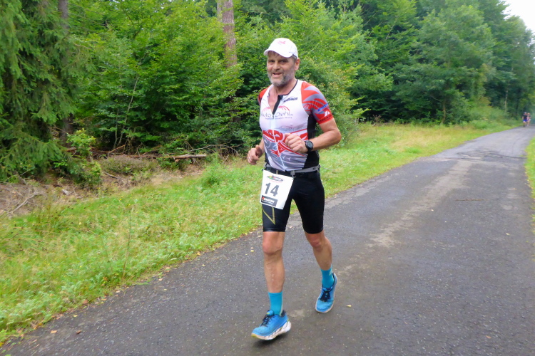 Beim Rundblick kann ich hinter mir nun Bewegungen wahrnehmen. Nach einiger Zeit kommen die Führungsradler des ersten Ultramannes. Thorsten Vackiner scheint zu schweben. Es sieht zumindest entspannt aus, wie er so an mir vorbeikommt. Dazu noch ein lockerer Spruch auf den Lippen - er hat echt was drauf. Nur 1h08 für die ersten 15 Kilometer. Alle Achtung!