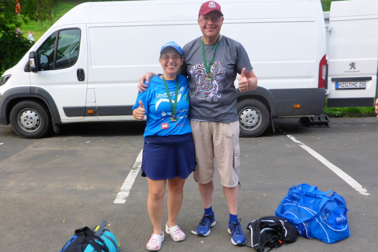 Im Zielbereich gibt es eine außergewöhnliche Medaille, und irgendwo zaubert Norbert ein Muffin hervor. Hinter mir kommt Andreas, der eigentlich die ganze Zeit vor mir war, ins Ziel. Er hat wohl auf den letzten Kilometern einen Abzweig verpasst.