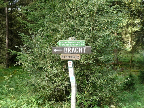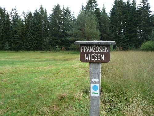 Die Franzosenwiese erreichen wir bei km 19. Sie hat ihren Namen von der historischen Nutzung durch die Hugenotten und Waldenser: Sie durften das Moor nutzen, hatten aber die Auflage, zuerst die Scheunen des Langgrafen mit Heu für die Wildfütterung zu füllen, den Rest durften sie dann selbst verbrauchen.