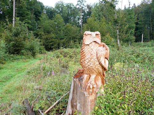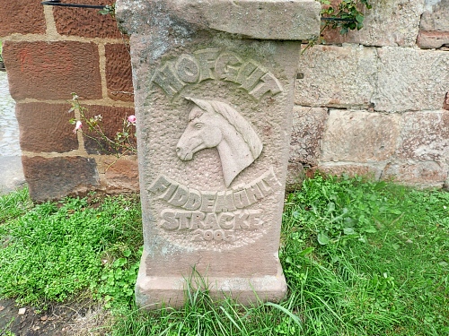 Kurz laufen wir an der Landstrasse entlang. Würden wir die jetzt nach Norden laufen, kämen wir zum Wolfstein. Der Stein steht zum Gedenken an eine Frau, die hier 1654 von einem Wolf zerfleischt wurde. Auf einer separaten Tafel ist die rekonstruierte Inschrift zu lesen. Sehr interessant, denn neuere Forschungen bezweifeln, dass ein Wolf am Tod der Frau schuldig war.