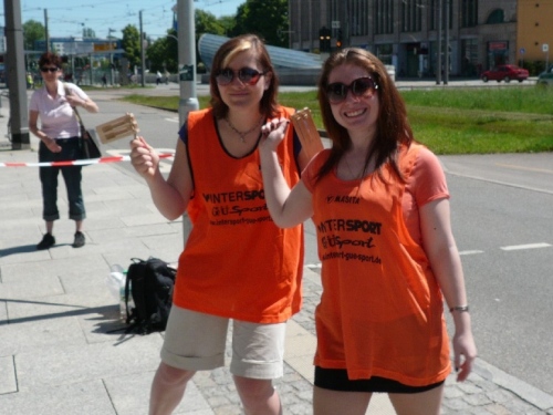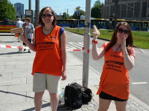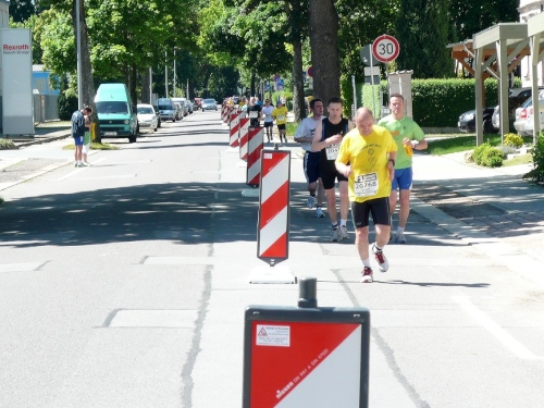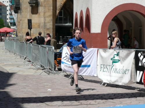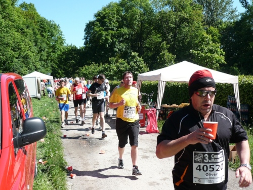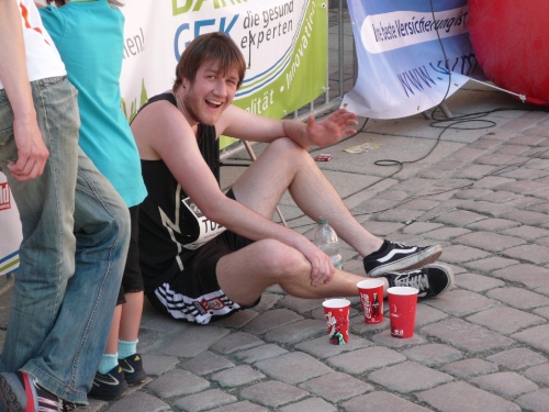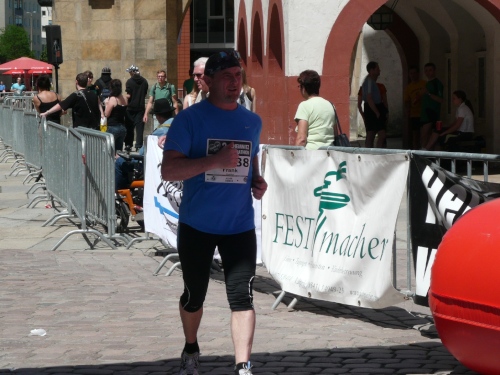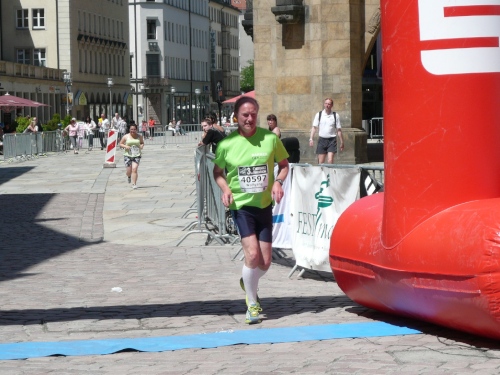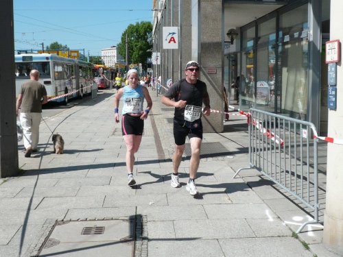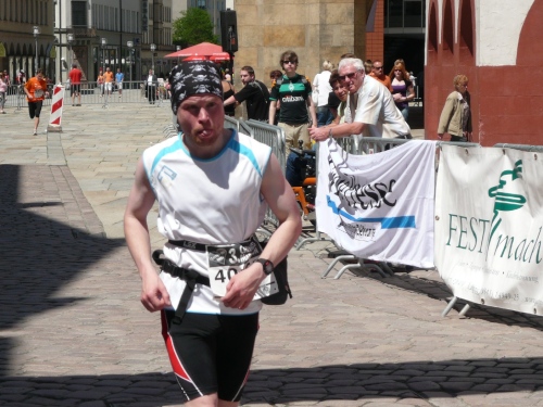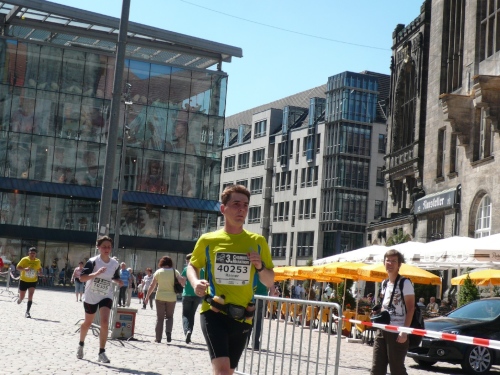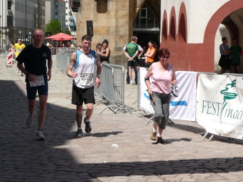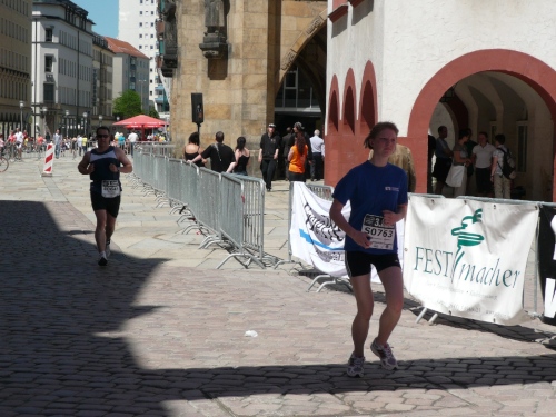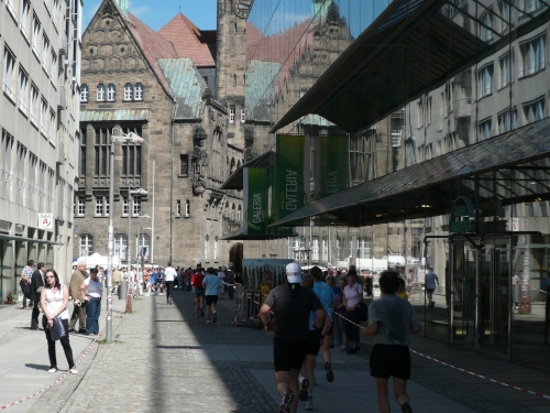 In der Innenstadt belaufen wir einen kleinen Rundkurs, der von den Helfern gut abgesichert ist. Es gibt sogar eigene Durchlässe für die Zuschauer und Passanten. Am Neumarkt, kurz nach dem Durchlaufen des Zielbogens findet man eine weitere Verpflegungsstelle mit erweitertem Angebot.