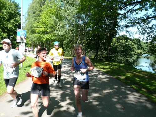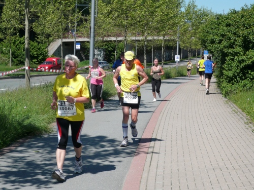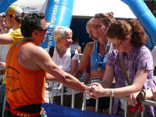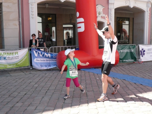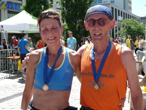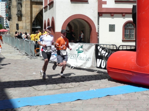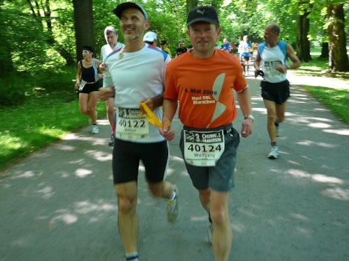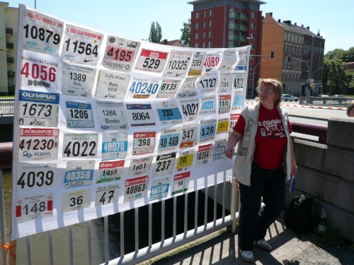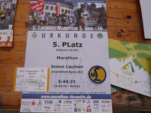 Im Ziel spricht mich dann Heike Bergmann aus Zeulenroda und Jens Fräsdorf an. Beide berichten, dass 2010 der in ihrer Heimat stattfindende Weidatalmarathon in diesem Jahr ausfällt. Schade. Als ich meine Urkunde am Infostand abhole, hat mich mein Tempogefühl nicht im Stich gelassen. Alle vier Runden weichen lediglich rund eine Minute voneinander ab. Platz fünf der Klasse M50. Und wer noch das Marathonabzeichen des DLV mitnehmen will, der kann es einpacken. Und braucht nichts dafür zu entrichten. Gut, nicht?