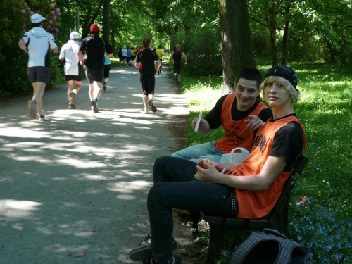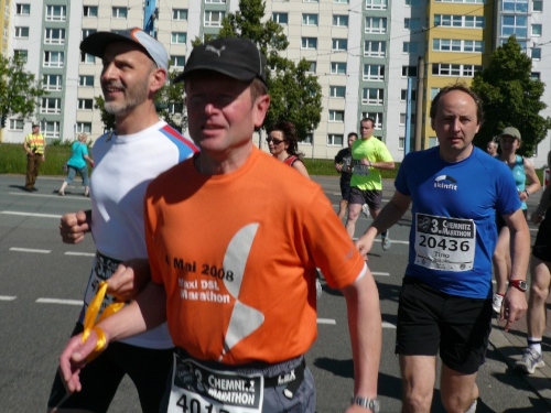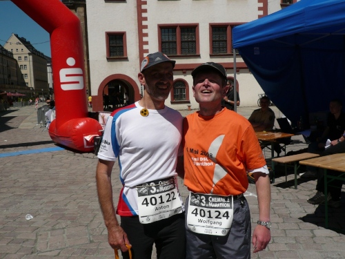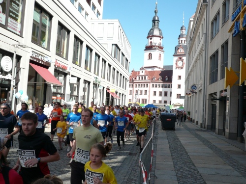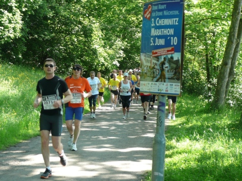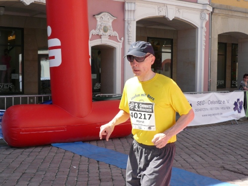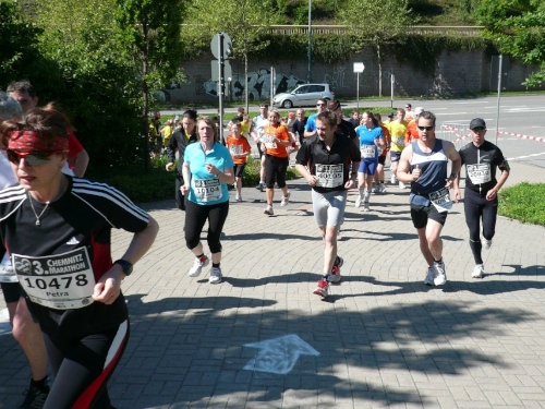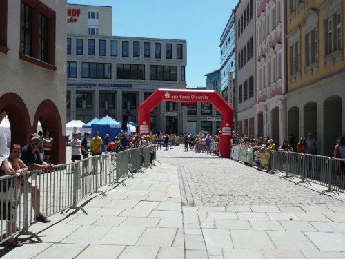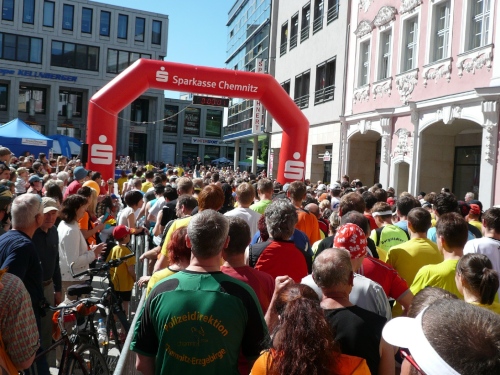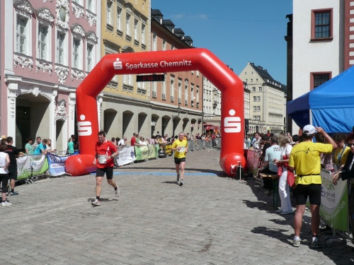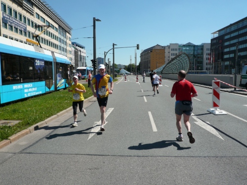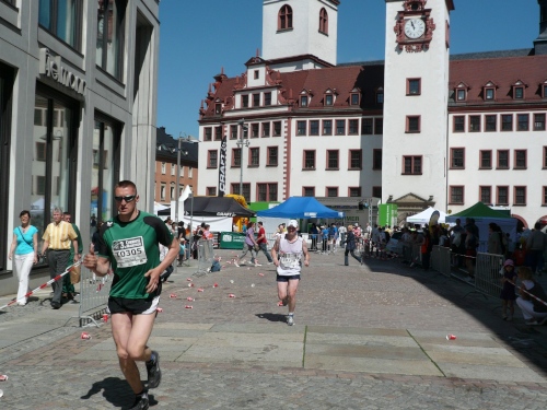 Die zweite Runde wird es ruhiger auf dem Kurs, den die Viertelmarathonläufer sind fertig mit ihrem Rennen. Teilweise war es auf der ersten Runde anfangs im Stadtpark ein wenig eng. Viel Zuspruch finden wir auf der Altstadtrunde ums Rathaus. Auf der Annaberger Straße und im Stadtpark ist es halt weniger. An den Wechselpunkten oder bei den Musikdarbietungen finden sich Zuschauer, Neugierige, Spaziergänger und Betreuer.