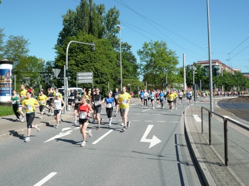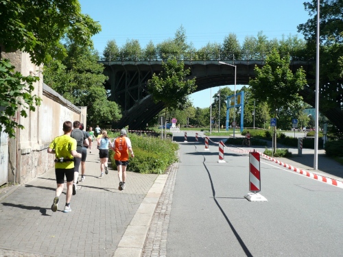 Mit dem Startschuss setzt sich ein großes Läuferfeld auf dem Neumarkt in Bewegung. Nach wenigen Kurven geht es auf die Annaberger Straße, das einzige längere Stück, wo wir der Sonne ausgesetzt sind. Nur einmal geht es über eine abgesperrte Hauptstraße. Die Reichsstraße überqueren wir auf einer Überführung, wo sich uns etwa zehn Höhenmeter entgegenstellen. Aber dann nach dem Durchlaufen unter einer Eisenbahnlinie sind wir schon im Stadtpark angekommen. Kilometerschild zwei folgt sofort.