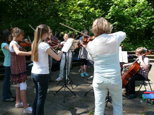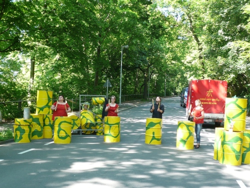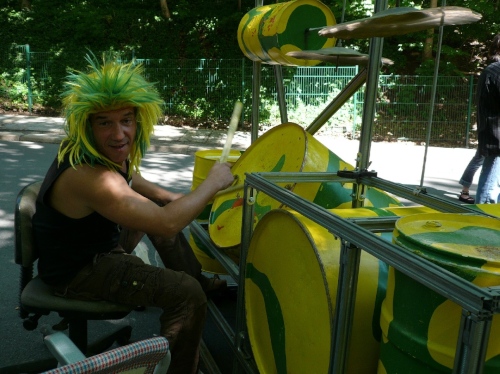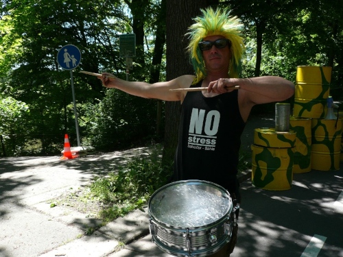 Der Kurs durch die grüne Lunge von Chemnitz ist sehr abwechslungsreich. Zu Beginn steht eine Trommlergruppe mit gelb-grünen Blechfässern parat. Die bearbeiten gerade ihre Instrumente mit Inbrunst. Ein bunter Hund, passend mit neonfarbener Perücke (oder hat der seine Haare gefärbt), ist auch darunter. Oder ist es der Chef des Trommel-Projektes Querschlag? Ein paar Meter weiter singen Kinder aus dem Kindergarten Frühlingslieder. Damit nicht genug. Es warten weitere musikalische Gruppen. Auch klassische Musik ist darunter.